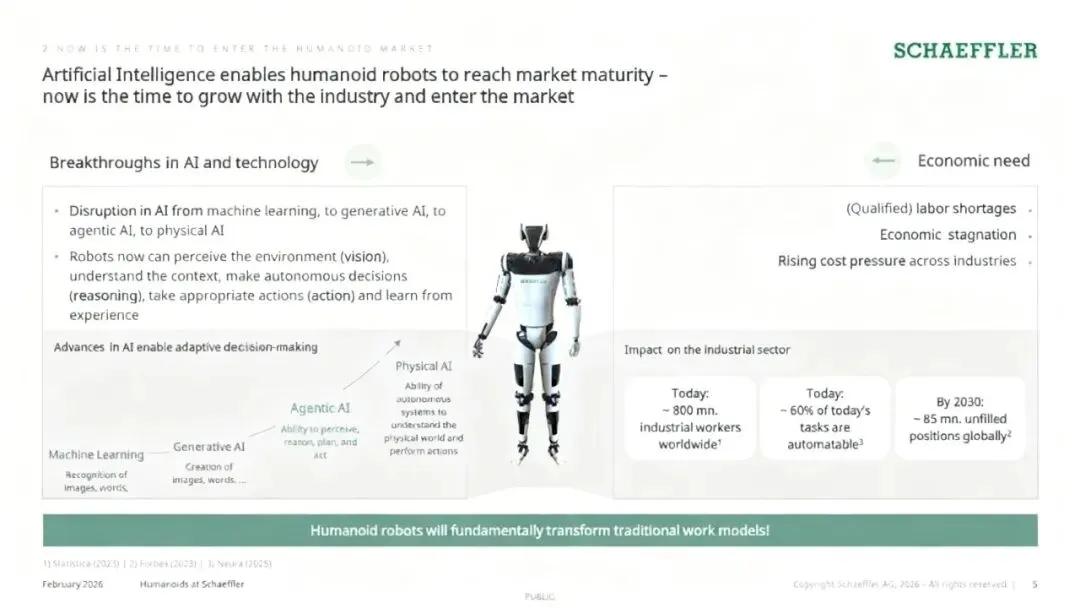 2026年2月,舍弗勒发布《舍弗勒的人形机器人》报告(获取完整版报告请见文末),明确将人形机器人关节执行器系统作为核心布局方向,目标到2030年拿下全球人形机器人市场超10%的份额。