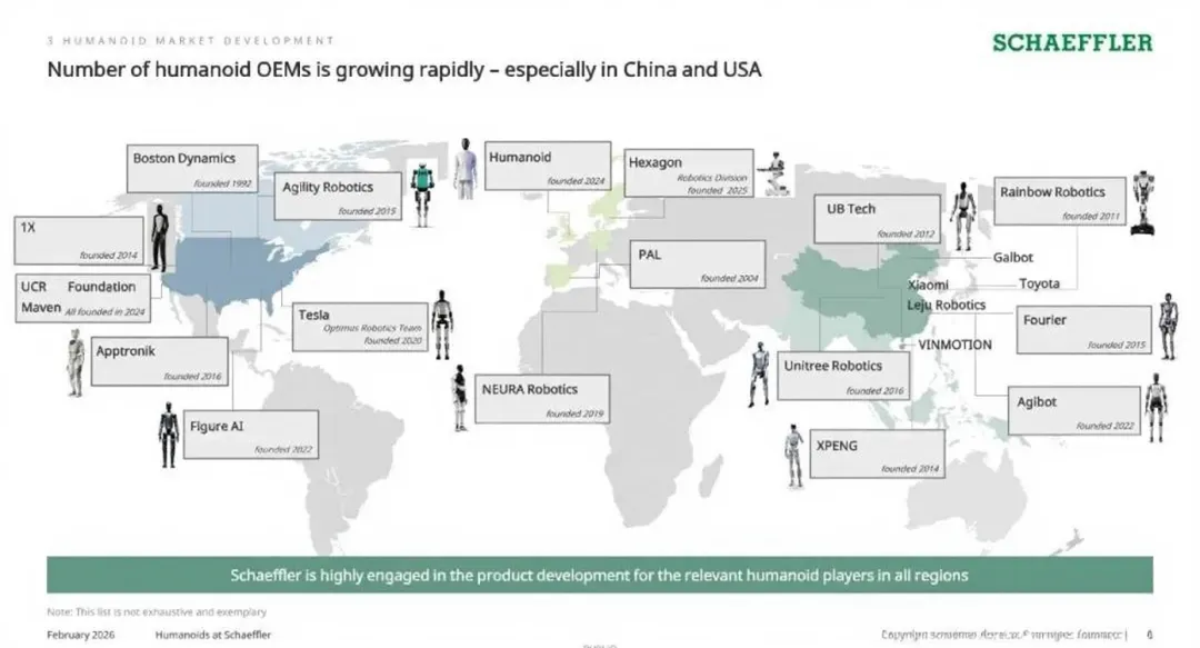 在全球范围内,舍弗勒与AgilityRobotics、NeuraRobotics、Humanoid等企业建立合作关系,2026年1月与Humanoid完成预阿尔法机器人概念验证,2025年11月与NeuraRobotics达成采购协议。在中国,舍弗勒打造太仓人形机器人灯塔工厂,依托NVIDIAOmniverse平台实现数字孪生化生产,为人形机器人产业提供合作平台。