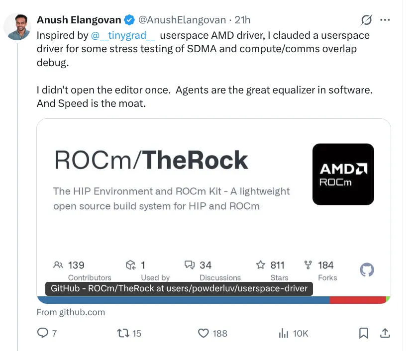 就在这几天,AMD 人工智能软件副总裁 Anush Elangovan 在社交平台上公开了一个让人直呼头皮发麻的项目:他完全没有打开任何代码编辑器,仅仅通过与 Claude Code 的交互,就“手搓”出了一个纯 Python 版本的 AMD GPU 用户态驱动。