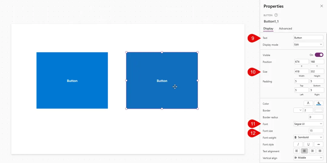 右侧属性栏可以改按钮显示文字, 可以改尺寸, 改字体字号.当然, 像在PPT里拖拽控件改大小, 双击改文字也是可以的, 很大程度上, 你在编辑App里的控件的视觉属性时, 完全可以参考PPT里的操作.