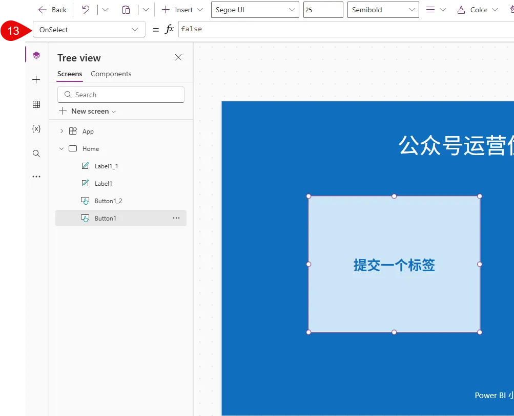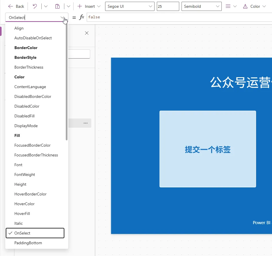 当你选中一个控件时, 上面属性栏会出现这个控件最常用的一个APP属性, 比如按钮的作用就是当你点击它时, 它会有一系列的反应, 所以这里就叫做 OnSelect, 默认的属性是false, 那就是你按一下, 它啥也不发生,因为你没有给它赋值.