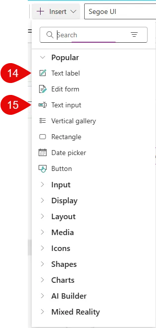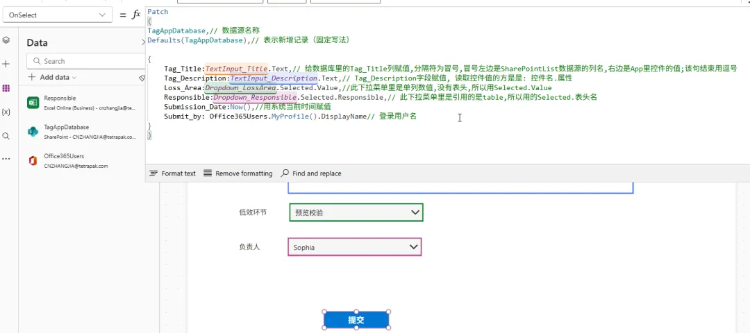 Patch(TagAppDatabase,// 数据源名称Defaults(TagAppDatabase),// 表示新增记录(固定写法){ Tag_Title: TextInput_Title.Text,// 给数据库里的Tag_Title列赋值,分隔符为冒号,冒号左边是SharePointList数据源的列名,右边是App里控件的值;该句结束用逗号 Tag_Description: TextInput_Description.Text,// Tag_Description字段赋值, 读取控件值的方是是: 控件名.属性 Loss_Area:Dropdown_LossArea.Selected.Value,//此下拉菜单里是单列数值,没有表头,所以用Selected.Value Responsible: Dropdown_Responsible.Selected.Responsible,// 此下拉菜单里是引用的是table,所以用的Selected.表头名 Submission_Date:Now(),//用系统当前时间赋值 Submit_by: Office365Users.MyProfile().DisplayName// 登录用户名 })