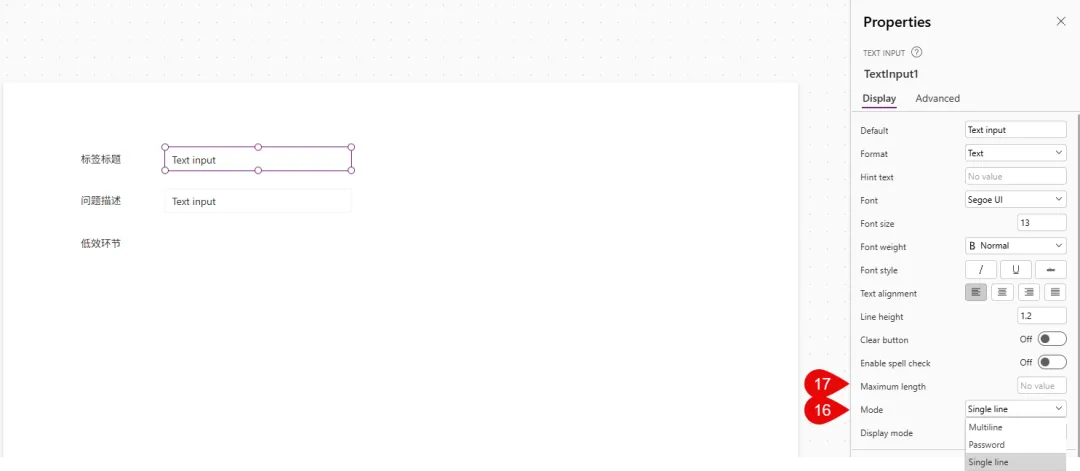 好的, 认识这2个控件后, 咱们就像做PPT一样把页面做出来. 关于”文字输入”控件, 有一个很重要的属性就是它的Mode, 是单行文字,还是多行文字, 或是密码. 这个控件本身没有内置字符上线, 能存储多少字符最终是要跟存储该字段的数据库属性匹配的. 所以你需要根据数据库的存储容量来设置该控件的MaxLength属性(就在Mode上面), 避免用户输入超长文本但是无法提交至数据库, 最终导致提交失败.