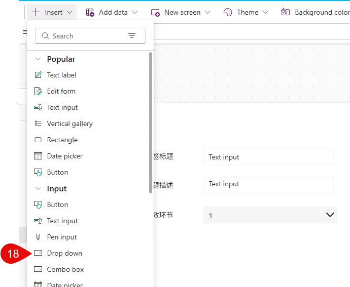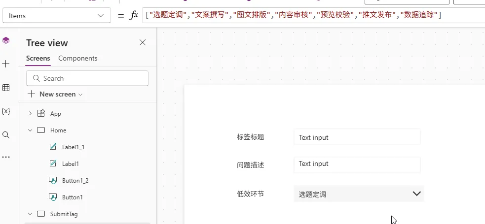 Drop down有一个很重要的属性—- Items, 这个决定了下拉菜单里有啥内容, 如果下拉菜单内容简单且长期固定, 那就可以直接写入公式里, 它的公式是这样的, 最外中括号, 里面双引号,分隔用逗号.
