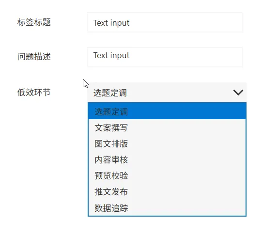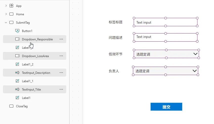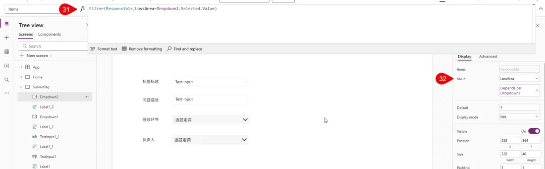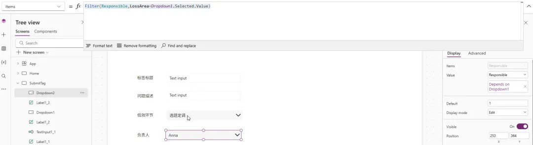 接下来要考虑的是如何将这里的低效环节跟它对应的负责人联系起来, 而且这个负责人的名字是需要最终写入数据库的, 否则负责人的页面无法根据他的名字筛选. 这里假定每一个环节对应一个负责人, 用户选中低效环节后, 负责人自动显示. 所以这里我们需要插入一个Text label控件, Text就用公式来匹配.