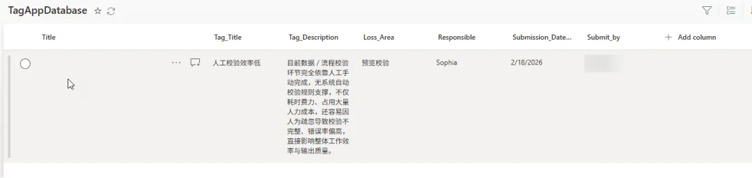 如下Sharepoint List, Title是系统默认, 可以忽略, 其他列为我手动加入, 除了Submission_Date是日期格式, Tag_discription是多行文本格式, 其他都是单行文本格式.