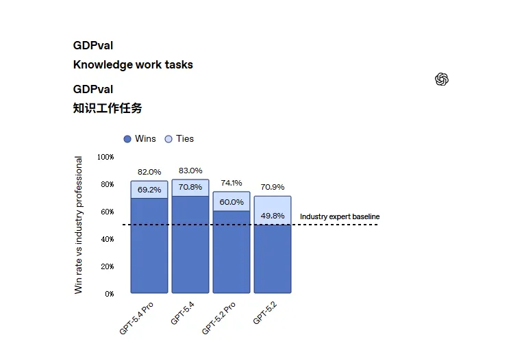 官方在GDPval基准上给出了GPT-5.4的成绩:83.0%(与 GPT-5.2 的 70.9% 相比)。GDPval是OpenAI内部自己提出的一个针对知识工作任务(Knowledge Work Tasks)的评估基准,用于衡量大语言模型LLM在模拟真实职场场景中的能力表现。