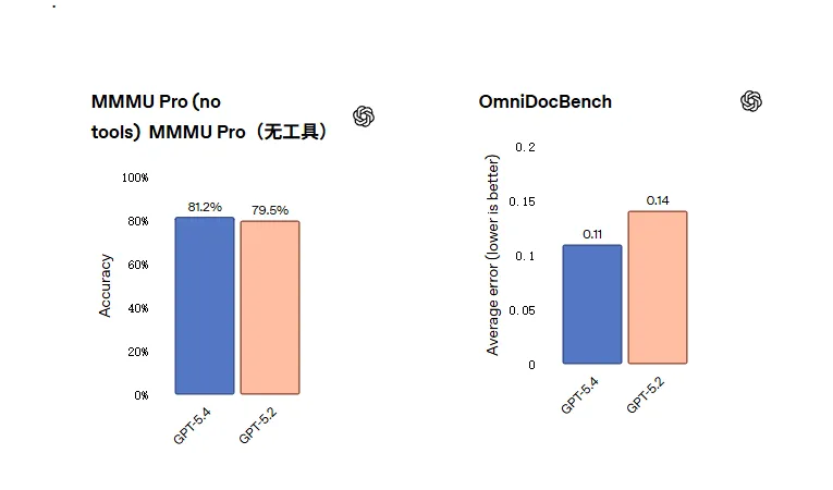 视觉理解基准 MMMU-Pro 上,GPT-5.4 达到 81.2%(比 GPT-5.2 的 79.5% 有提升),文档解析基准 OmniDocBench 的平均错误(normalized edit distance)从GPT-5.2的0.140降到GPT-5.4的0.109,表明在高保真文档读写和结构化输出上更精确。
