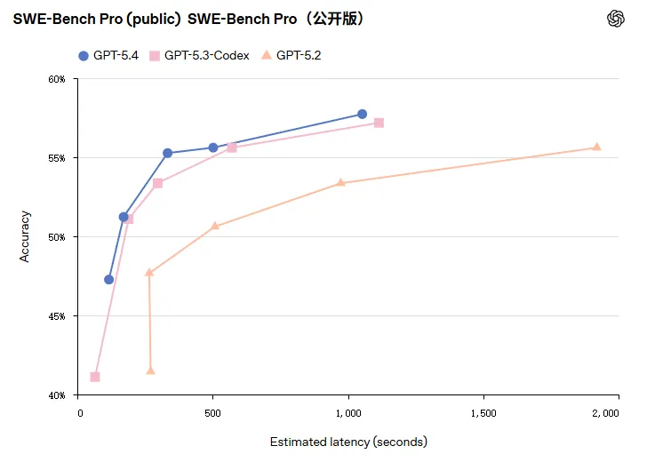 因为以往可能需要专门调用Codex系列模型来处理复杂编程,而GPT-5.4将这些专用能力内化了,表现在代码生成、语法理解、Debug上的基准水平直接达到了 GPT-5.3-Codex 的水准。