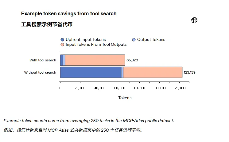 于是OpenAI在MCP-Atlas的250个任务评测里比较了两种配置:一是把所有 MCP 函数全部暴露在模型上下文中,二是把这些 MCP 服务放在 tool search 后面。