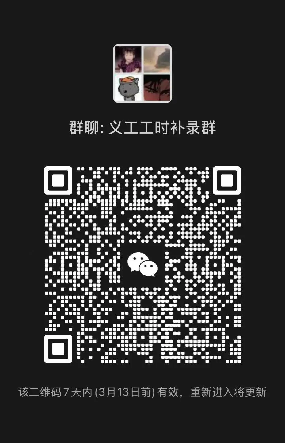 为了高效、精准地处理各位同学的义工工时补录问题,方便大家集中反馈情况、提交相关证明材料,我们特意建立了义工工时补录专项微信群,请有工时未添加需求的同学,尽快扫码加入群聊,在群内详细说明个人信息、参与的义工活动名称、活动时间及相关佐证内容,我们会安排专人逐一登记、核实,并尽快完成工时补添工作。