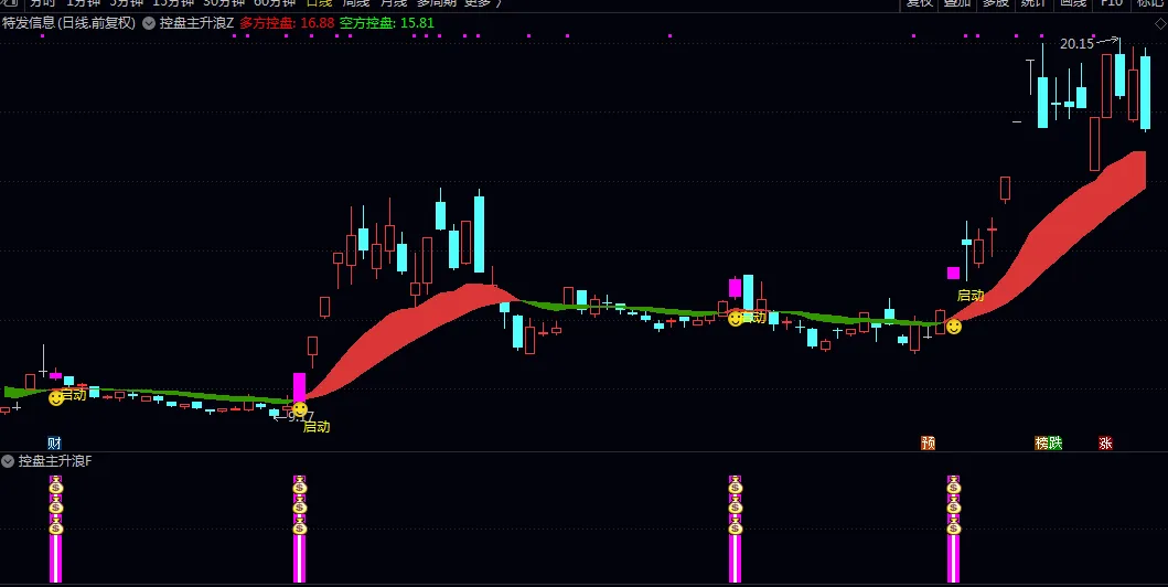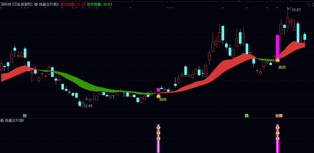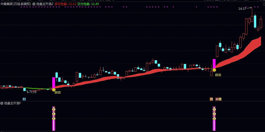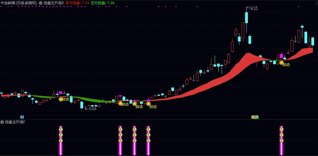 💡 粉色K线+”启动”标识:代表多方控盘带向上穿越空方控盘带,是趋势转折的初步信号