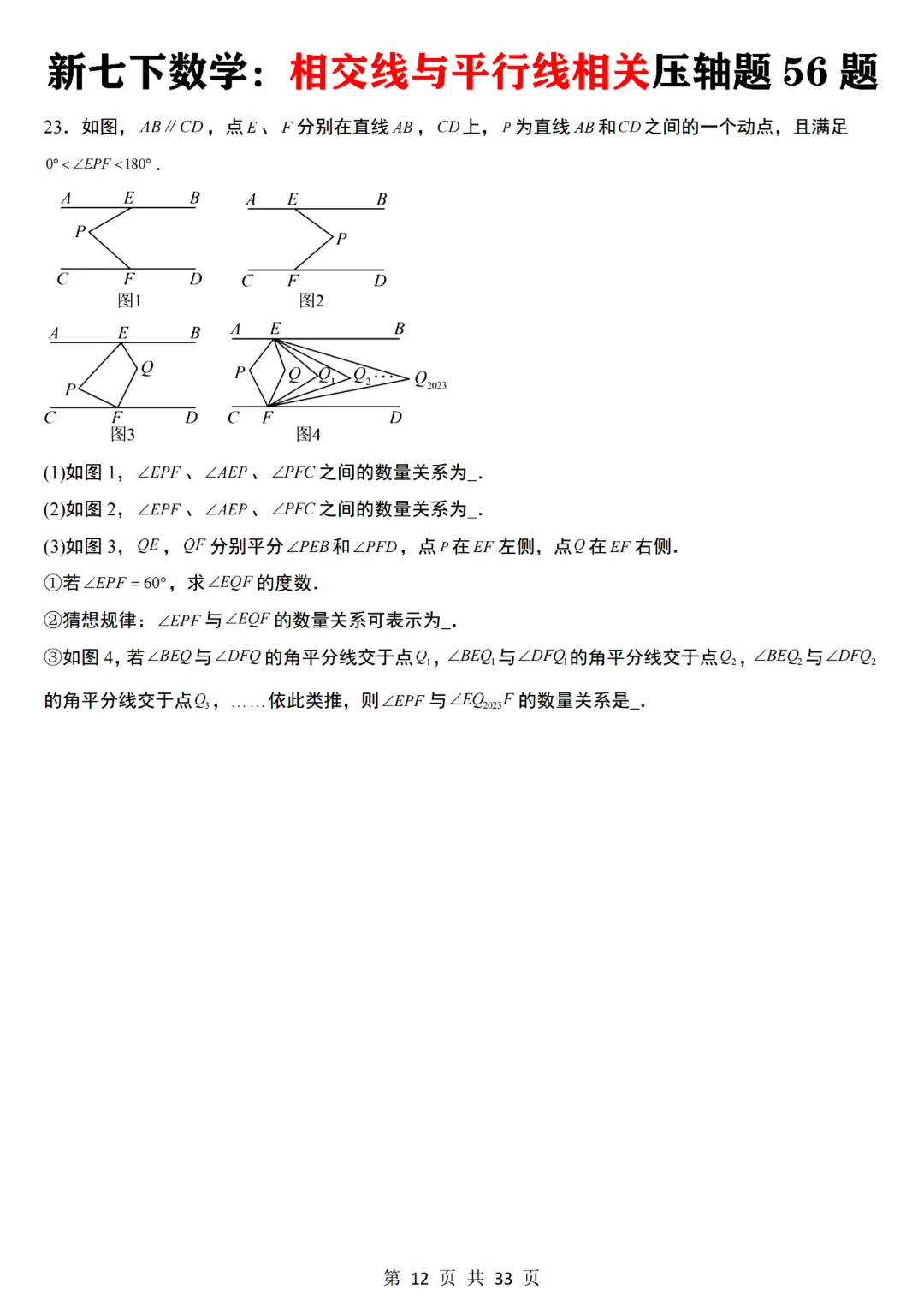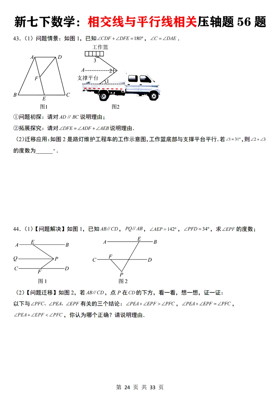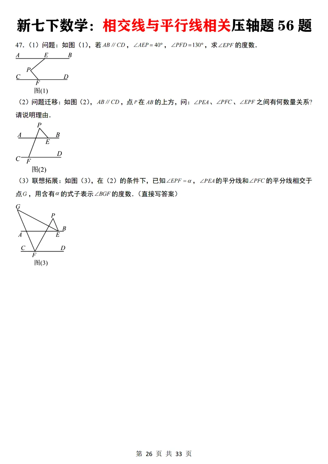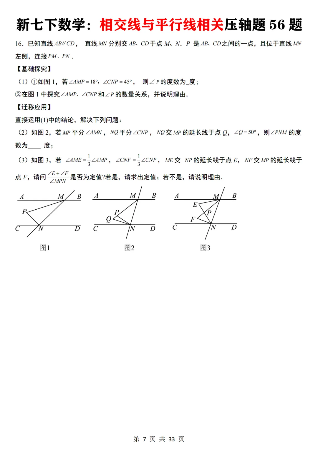 七年级下册数学【通用版】相交线与平行线相关压轴题共56题带答案丨完整电子版可打印
