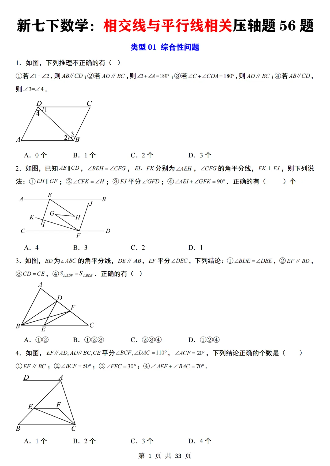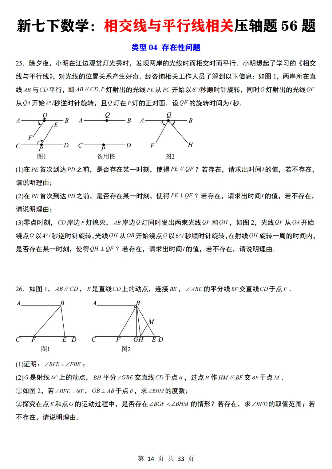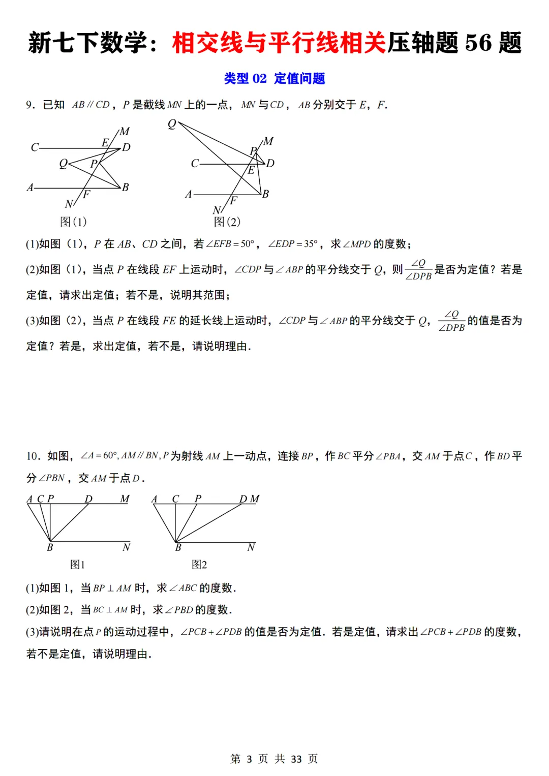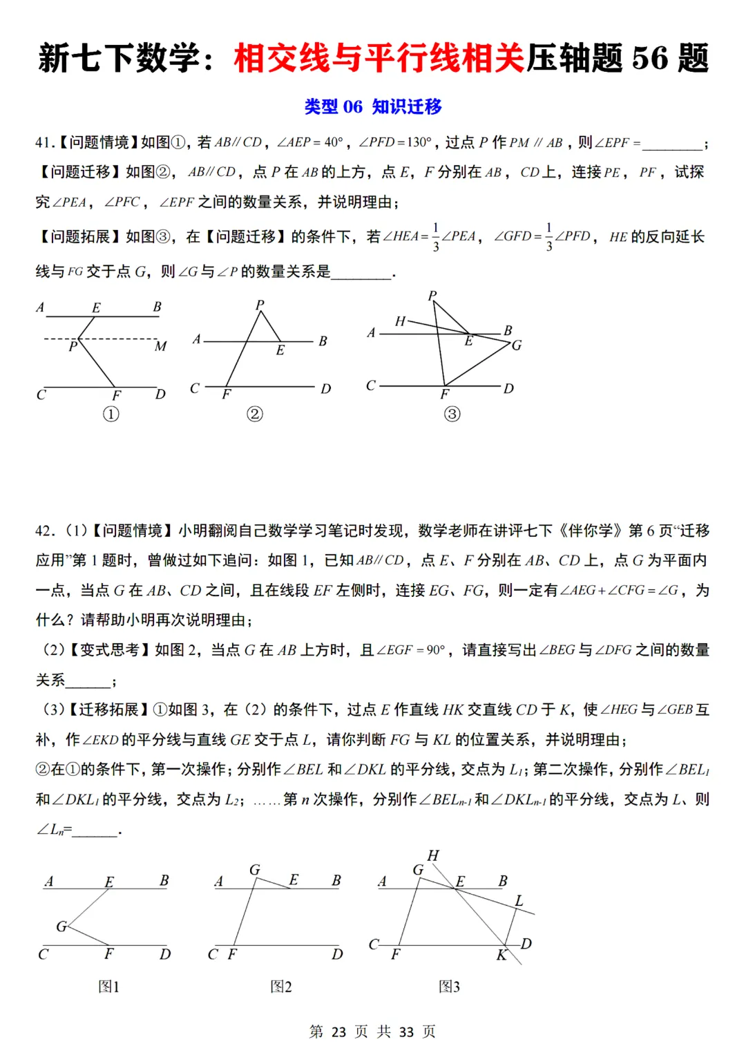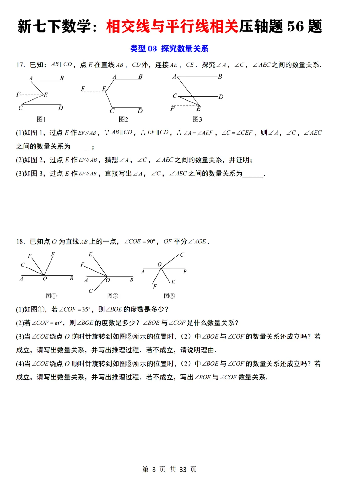 七年级下册数学【通用版】相交线与平行线相关压轴题共56题带答案丨完整电子版可打印
