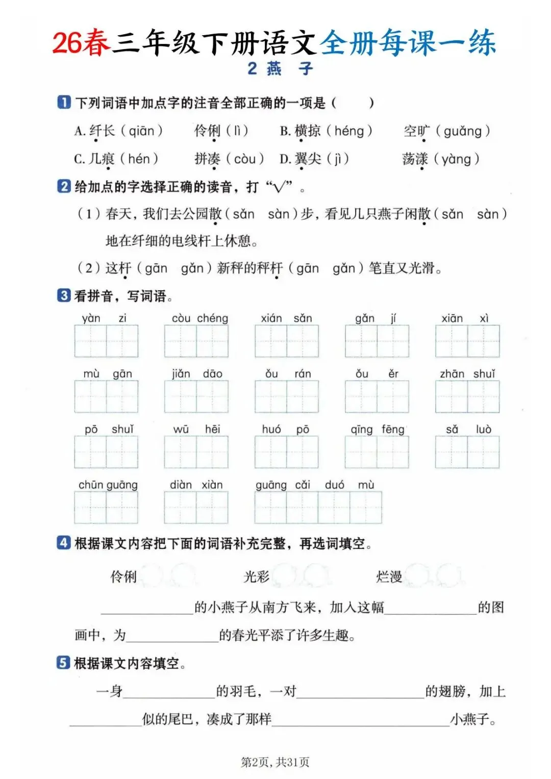 26春语文三年级下册『全册每课一练』(电子版可打印)