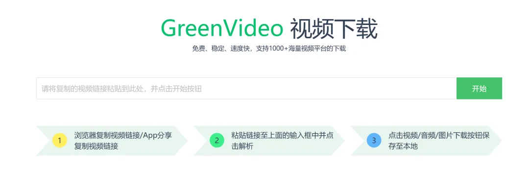 GreenVideo 是一个完全免费、无次数限制的在线视频下载工具,支持 B站、抖音、YouTube、TikTok、Instagram 等 1000+ 视频平台,粘贴链接即可解析下载,无需安装任何软件。