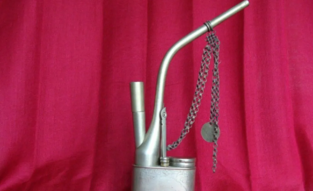 图中这细嘴的叫水烟壶,黄铜身子冷冰冰的,管子弯着像条小蛇,侧边挂着一串小链子,咔哒一声掀盖就能添水添丝,老人家两指一捏烟锅一凑火星子,水腔咕嘟咕嘟响两下,人也就沉下去了,过去赶集前来一口压压气,现在烟盒子铺满街,它在柜顶上落灰。