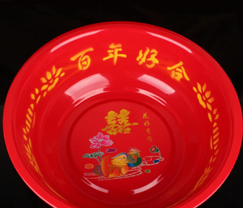 这红得晃眼的盆子叫双喜脸盆,搪瓷一体,里口写着“百年好合”,结婚那天放在炕头,盆里压个红枣花生图个好彩头,后来也洗菜洗脸用,搪瓷边磕掉一小块也不扔,家里来客一端出来就喜气腾腾。