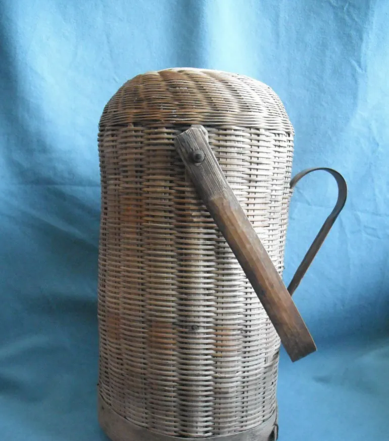 这个高挑的家伙叫竹壳热水瓶,外面竹编一圈一圈围得紧,提手是木的,里头扣着玻璃胆,冬天打来的开水塞进去,半宿还烫手,出门串亲戚拎着它就像拎着一小桶热气,现在不差热水壶,竹壳却越看越顺眼。