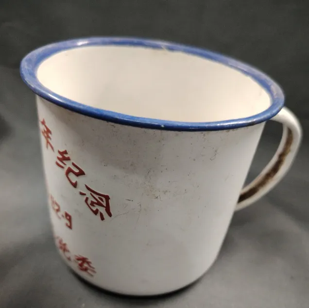 这个白底蓝沿的是搪瓷缸子,侧面红字写得正,边口磕了点掉皮也能照喝,早上泡茶叶,午后盛稀饭,最能熬的是开水烫嘴那一下,人哆嗦完却觉得精神都醒了。
