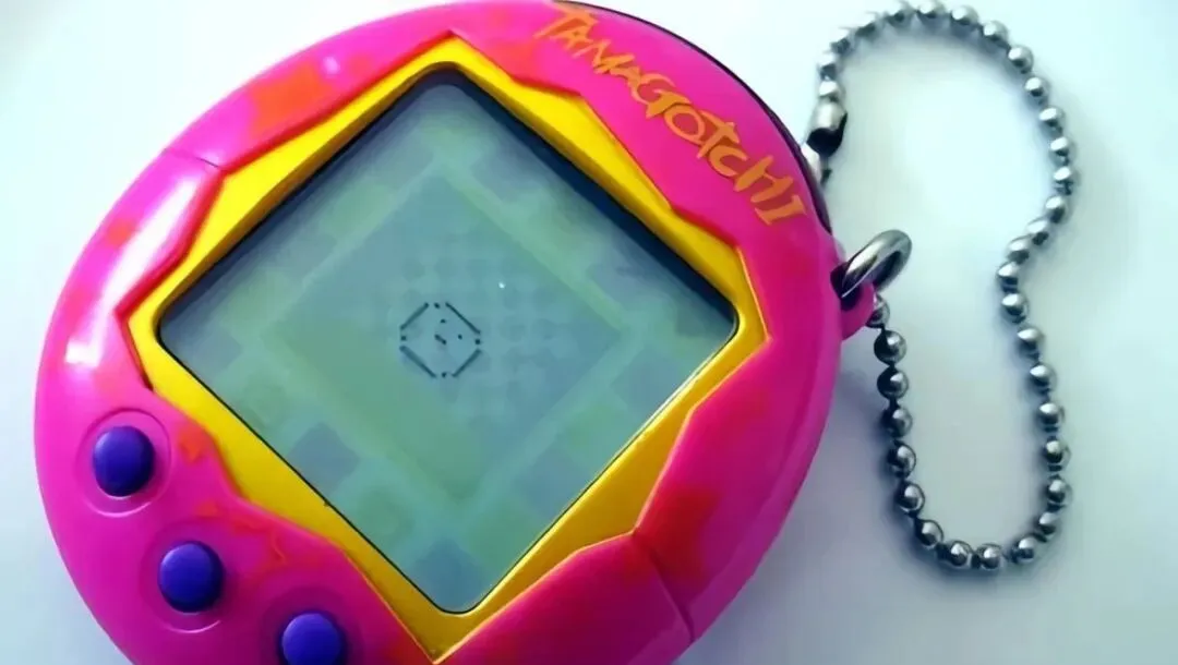 这小圆饼是电子宠物,屏幕里一团像素的小家伙,一会儿饿一会儿闹,放学回家先喂它几粒,再写作业,电量一空它就躺平,第二天同桌嘀咕说你这娃怎么老生病,俩人对着按键抢着救它。
