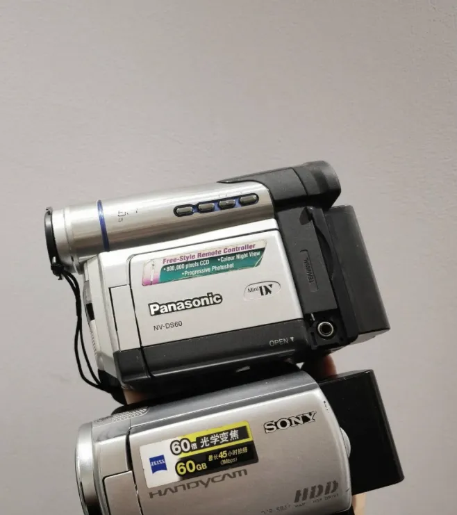 这两台银黑配色的是家用DV,带带子拎着,盒带卡哒一推就进去,婚礼满月抓周都靠它,回放时全家围在一起听自家笑声,画质搁到现在不够看,可那点抖动是真实。