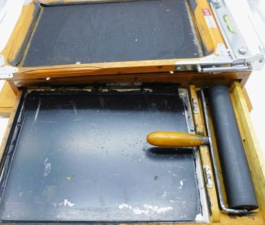 这黑滚筒是手写油印机,蜡纸先刻好,夹进去滚轴一刷,油墨味冲鼻,成摞的讲义从一边出,老师让我们搬到走廊晾着,指尖全是黑点,洗半天也不干净。