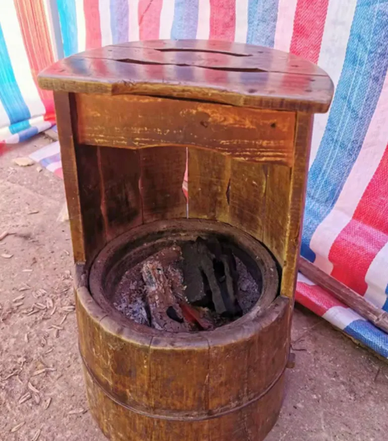 这个木头肚子的叫烤火桶,里头一只小火盆,饭后把灶膛里的炭刨出来丢进去,盖板一扣,腿脚放上去一暖,人就不愿意挪窝,过去没暖气全靠它熬冬天,现在地暖一开屋里春天,它还护着一家人的闲话会。