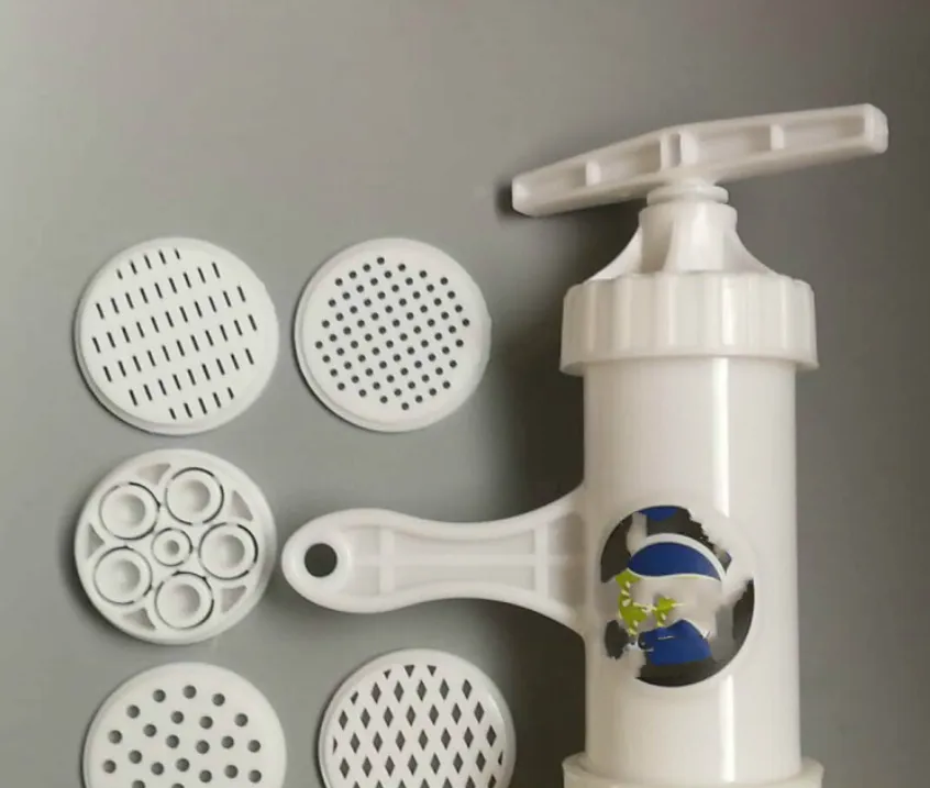 这把塑料的手压面机是后来家的小玩意儿,换筛片能挤粗的细的,拧把子要稳,不然面条歪成小蛇,孩子围着桌子等,锅里咕噜冒泡,捞起来一碗撒葱花,热气冲鼻尖。