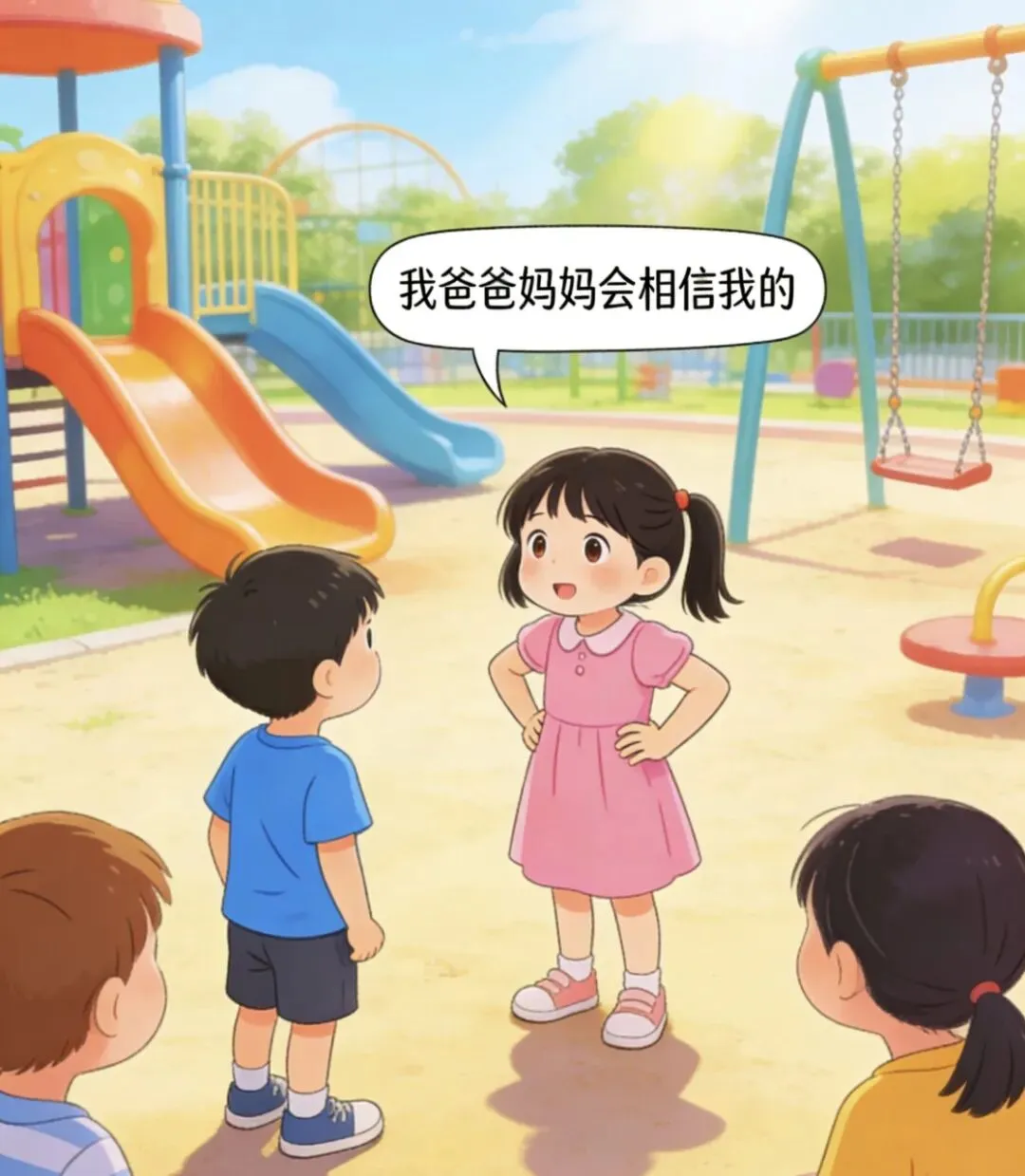 有一次在游乐场,我看到两个小朋友发生了争执,被误会的那个孩子没有哭闹辩解,只是仰着头很认真地说:“不是我做的,我爸爸妈妈会相信我的!”