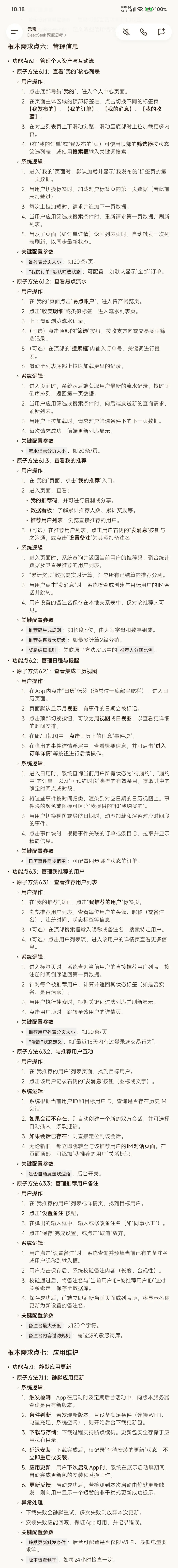 # 平台完善交互三级架构## 根本需求点零:账户与资产* **功能点0.1:账户注册与登录*** **原子方法0.1.1:创建账户*** **用户操作**:1. 在启动页或“我的”页面点击“注册/登录”。2. **账号输入与验证**:输入手机号/邮箱,输入框失去焦点时系统实时校验是否已注册。点击“获取验证码”,60秒内不可重复获取。3. **验证码校验**:输入收到的6位数字验证码(有效期5分钟),验证通过后进入下一步。4. **设置密码与协议**:设置密码(需至少8位,含字母和数字),再次确认密码。阅读并勾选《用户协议》与《隐私政策》。5. **邀请码(可选)**:可输入6位字母数字组合的邀请码。若留空,则默认关联平台官方推荐码(`SYSTEM`)。6. **第三方快速登录**:可选择微信、QQ、Apple ID图标进行授权。首次授权成功需绑定手机号并补全昵称信息。* **系统逻辑**:1. 对手机号/邮箱进行唯一性校验。2. 验证码发送频率和有效期受系统限制。3. 密码需满足强度规则。4. 创建账户成功,建立用户记录,并关联邀请码(用户填写或系统默认)。* **原子方法0.1.2:登录/登出账户*** **用户操作**:1. **登录**:在启动页或“我的”页面点击“注册/登录”,进入登录页。选择登录方式:【**密码登录**】输入已注册手机号/邮箱及密码;【**验证码登录**】输入手机号,获取并输入短信验证码;【**第三方登录**】点击微信等图标授权。点击“登录”按钮。2. **登出**:在“我的-设置”页面,点击“退出登录”,在二次确认弹窗中点击“确认”。* **系统逻辑**:1. 登录成功,系统返回并安全存储用户令牌,更新全局登录状态,跳转至首页或上次浏览页。2. 登录失败,系统根据具体原因(账号/密码/验证码错误、账号被封禁、密码错误次数超限等)返回明确提示。3. 确认登出,系统清除本地用户令牌及个人数据缓存,跳转至未登录状态的启动页。* **功能点0.2:管理易点资产*** **原子方法0.2.1:充值易点*** **用户操作**:在“我的-易点账户”点击“充值”,输入法币金额(需满足金额限制),选择支付方式(微信支付/支付宝/银行卡),跳转至支付APP完成支付。* **系统逻辑**:1. 系统校验输入金额是否符合`单笔最小/最大充值金额`限制及`单日累计充值限额`。2. 生成待支付充值订单,跳转支付。3. 支付成功后,系统按支付成功时有效的`易点:法币汇率`(如1:10)实时换算易点并计入用户余额,更新“我的余额”。4. 生成一条“充值成功”的流水记录。* **关键配置参数**:* `易点:法币汇率`:后台可配置的换算比例。* `单笔最小充值金额`:如1元。* `单笔最大充值金额`:如5000元。* `单日累计充值限额`:如20000元。* **原子方法0.2.2:提现易点*** **用户操作**:1. 在“我的-易点账户”点击“提现”。2. 输入提现的易点数量(系统自动按`当前汇率`换算为法币金额并显示)。3. 页面实时计算并显示`手续费`和`预计到账金额`。4. 从已绑定的提现账户(支付宝/微信/银行卡)中选择一个收款账户。5. 确认信息后,输入支付密码或进行生物识别验证,点击“提交申请”。* **系统逻辑**:1. 系统校验:a) 提现金额是否满足`单笔最小/最大提现金额`及`每日限额`;b) 用户易点余额是否充足(包含已被冻结的部分)。2. 校验通过后,立即冻结对应用户的易点余额,创建状态为“审核中”的提现记录。3. 平台审核人员处理。审核通过后,系统按`申请提现金额`扣除手续费,向指定支付渠道发起打款指令,记录支付流水,并将状态更新为“打款成功”,解除易点冻结并实际扣除。若审核驳回,状态更新为“已驳回”并解冻易点。* **关键配置参数**:* `易点:法币汇率`。* `提现手续费率`:如0.5%。* `单笔手续费最低/最高金额`:如1.00元 / 50.00元。* `单笔最小/最大提现金额`:如10.00元 / 20000.00元。* `每日提现次数上限`:如5次。* `每日提现总额上限`:如50000.00元。* **原子方法0.2.3:查看资产与流水*** **用户操作**:1. 进入“我的-易点账户”页面。2. 查看页面顶部显示的**当前可用余额**、**冻结中金额**及**资产总额**。3. 向下滑动浏览“收支明细”列表。4. (可选)点击列表顶部的“筛选”按钮,按“收支类型”或“交易类型”筛选流水记录。5. (可选)在搜索框内输入订单号或关键字,搜索特定流水。* **系统逻辑**:1. 进入页面时,系统从后端获取用户最新的资产概况(可用余额、冻结金额)。2. 同时,加载最近的流水记录列表(按时间倒序排列),每次加载一页(如20条)。3. 当用户滚动至列表底部时,自动加载下一页数据。4. 当用户应用筛选或搜索条件时,向后端发送新的请求,刷新列表。* **关键配置参数**:* `流水记录分页大小`:如20条/页。## 根本需求点一:表达意图* **功能点1.1:发布与管理“条目”*** **原子方法1.1.1:创建条目*** **用户操作**:1. 在首页或底部导航栏点击“发布”按钮。2. 在弹出的意图选择器中,选择“**提供**”或“**寻找**”。3. 进入表单编辑页面,填写以下信息:* **基础信息**:输入标题、详细描述,选择分类/标签。* **核心配置**:* `交付物形态`:从【实物商品 | 线下服务 | 虚拟服务 | 信息咨询】中选择。* `定价模式`:从【一口价 | 单价(时/次/件)| 可议价 | 免费】中选择。若选“单价”,需额外填写单价和单位。* `时间模式`:从【单次 | 可预约时段 | 长期有效】中选择。若选“可预约时段”,需在后续界面设置可用时段。* `空间模式`:从【线上 | 同城 | 特定地址 | 邮寄】中选择。若选“同城/特定地址”