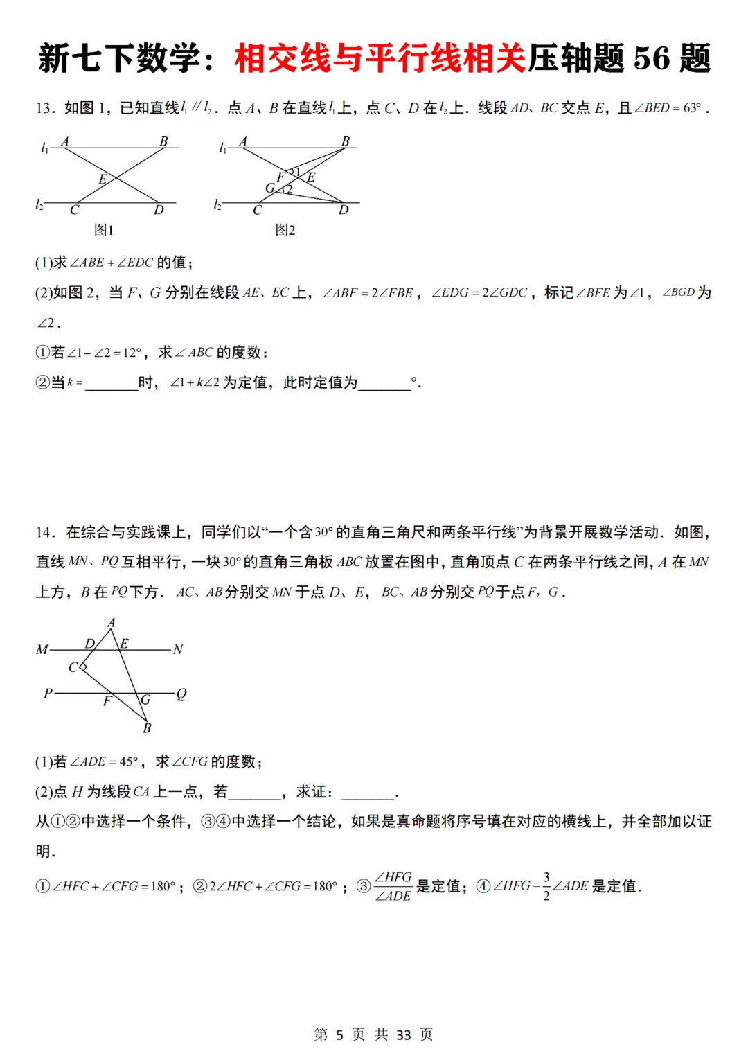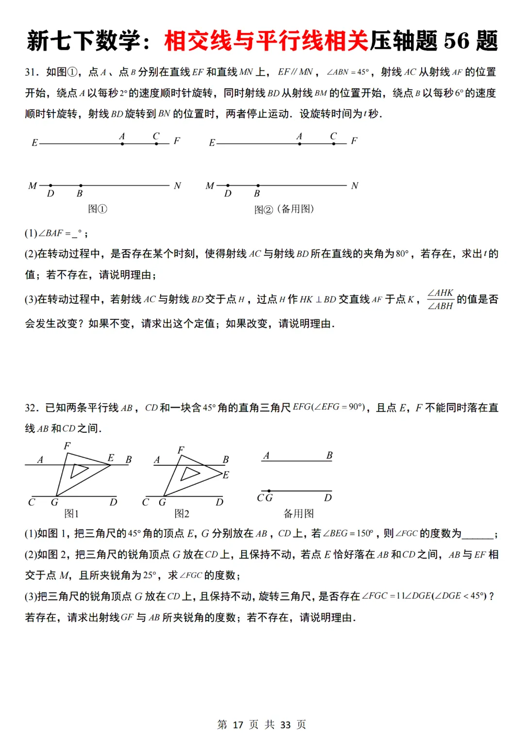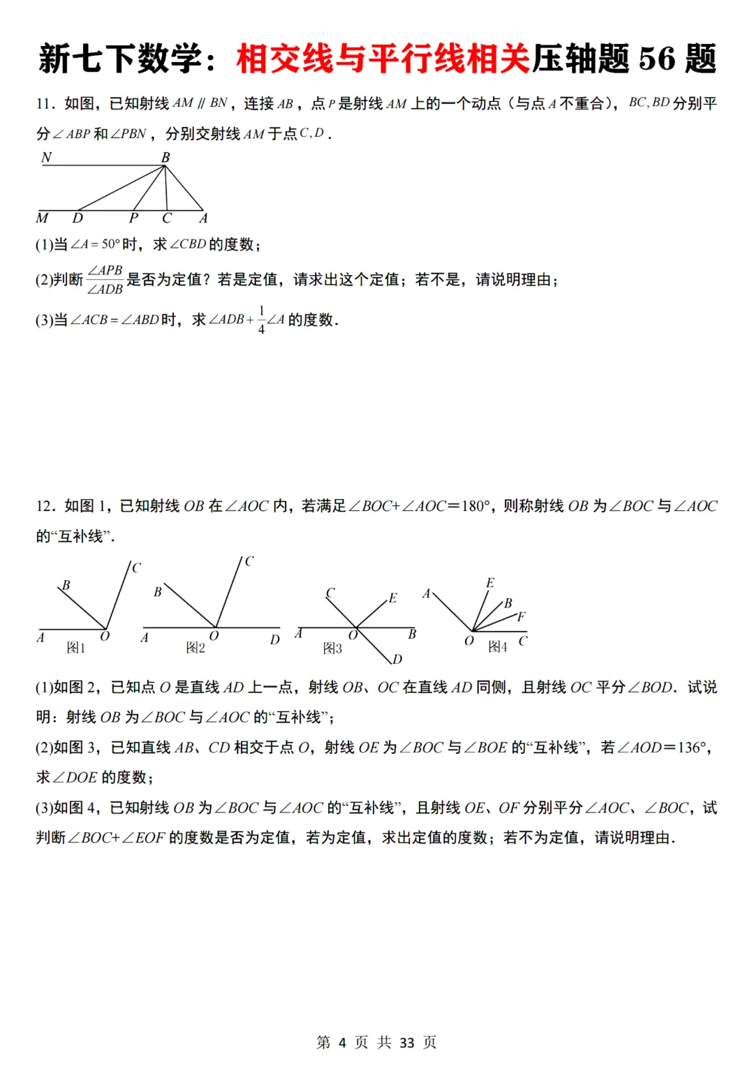 今天给大家分享的是:【七下数学通用版】初一下册数学相交线与平行线相关压轴题共56题带答案,完整电子版可打印