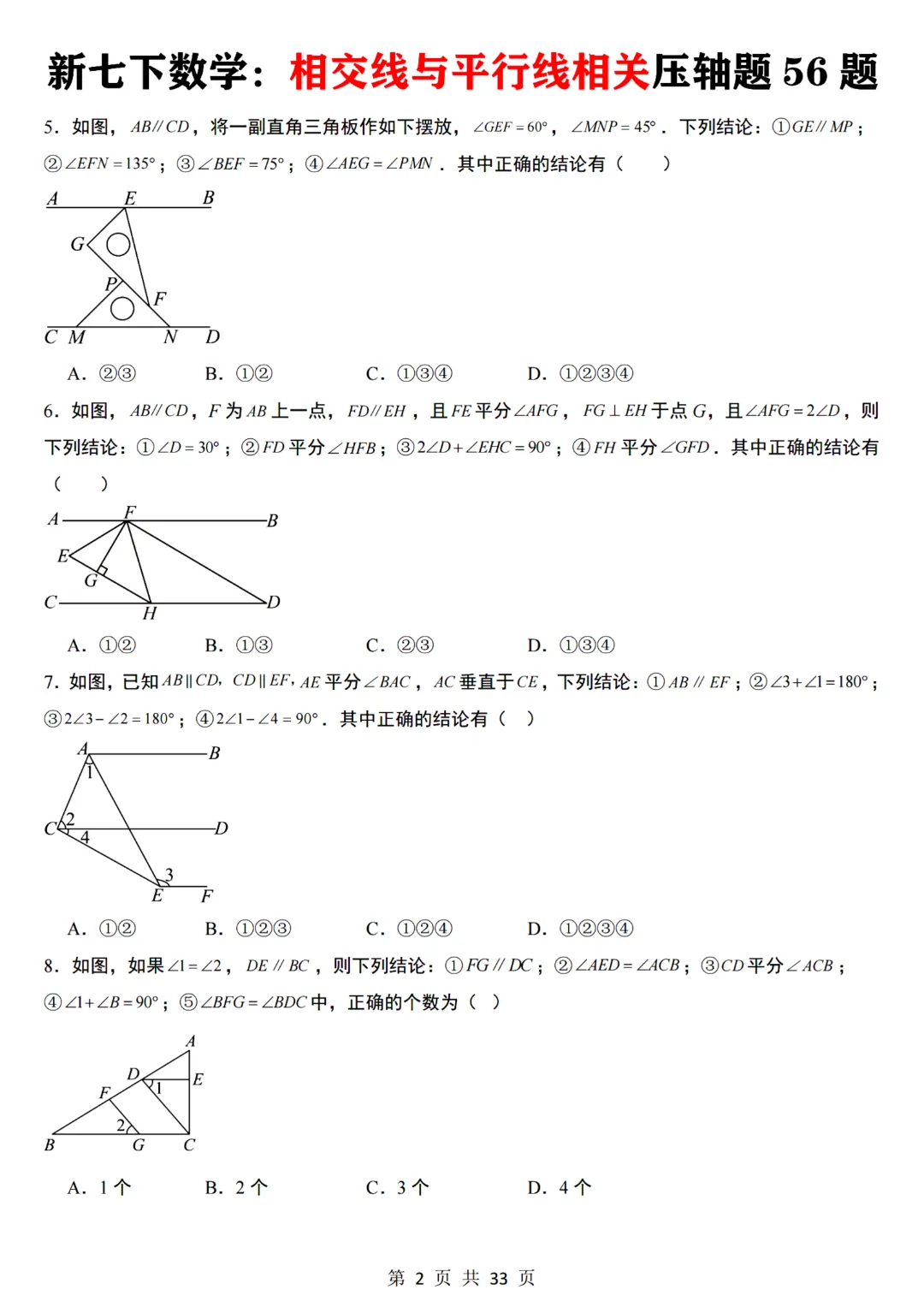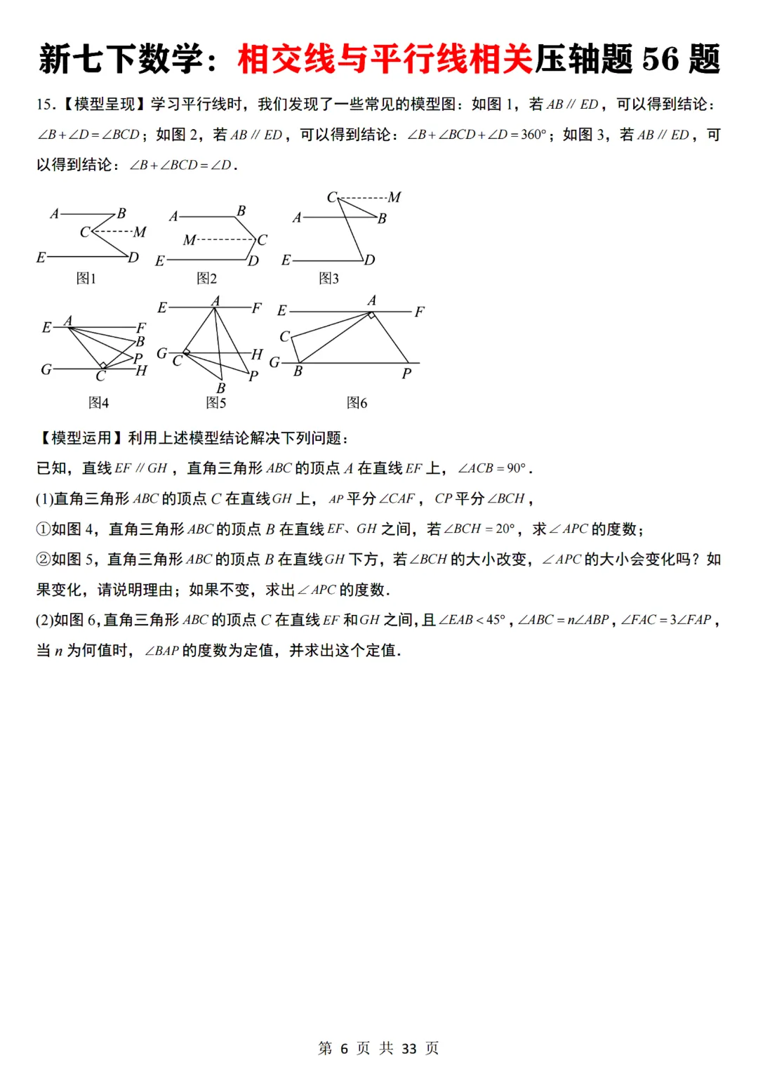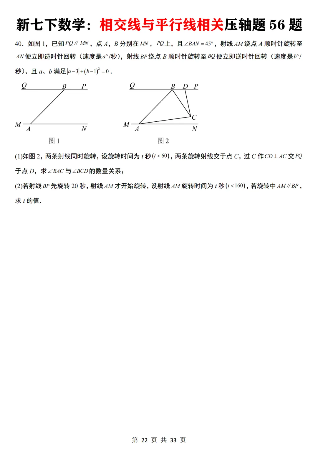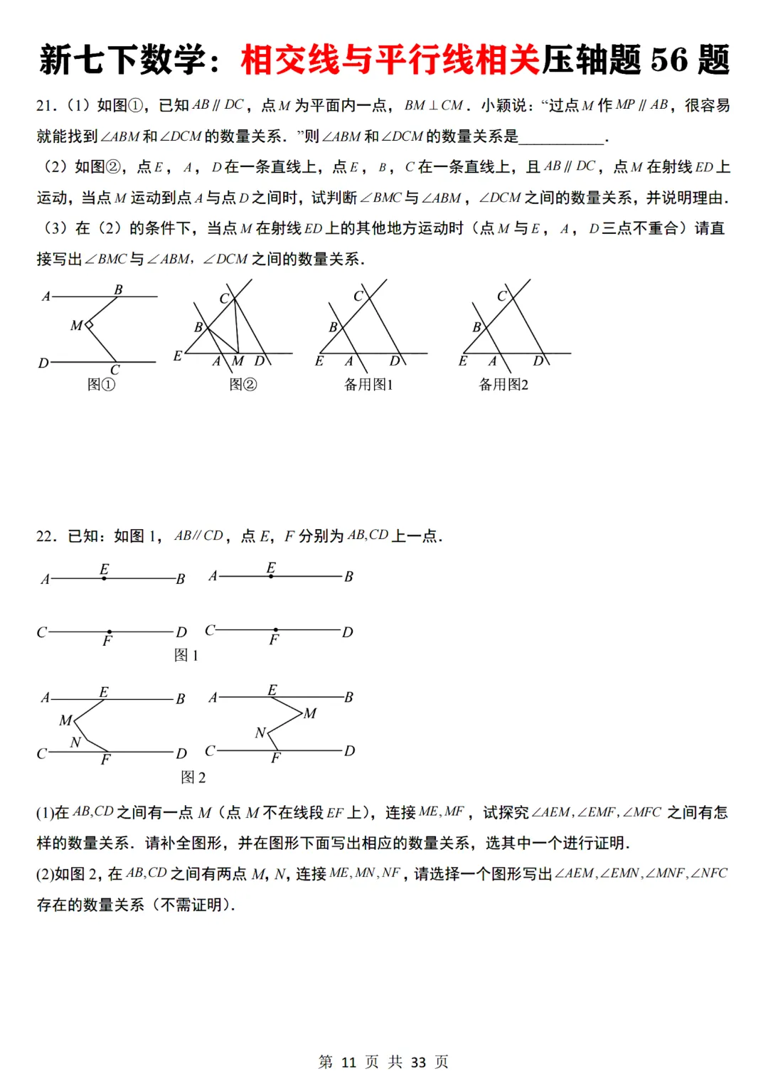 今天给大家分享的是:【七下数学通用版】初一下册数学相交线与平行线相关压轴题共56题带答案,完整电子版可打印
