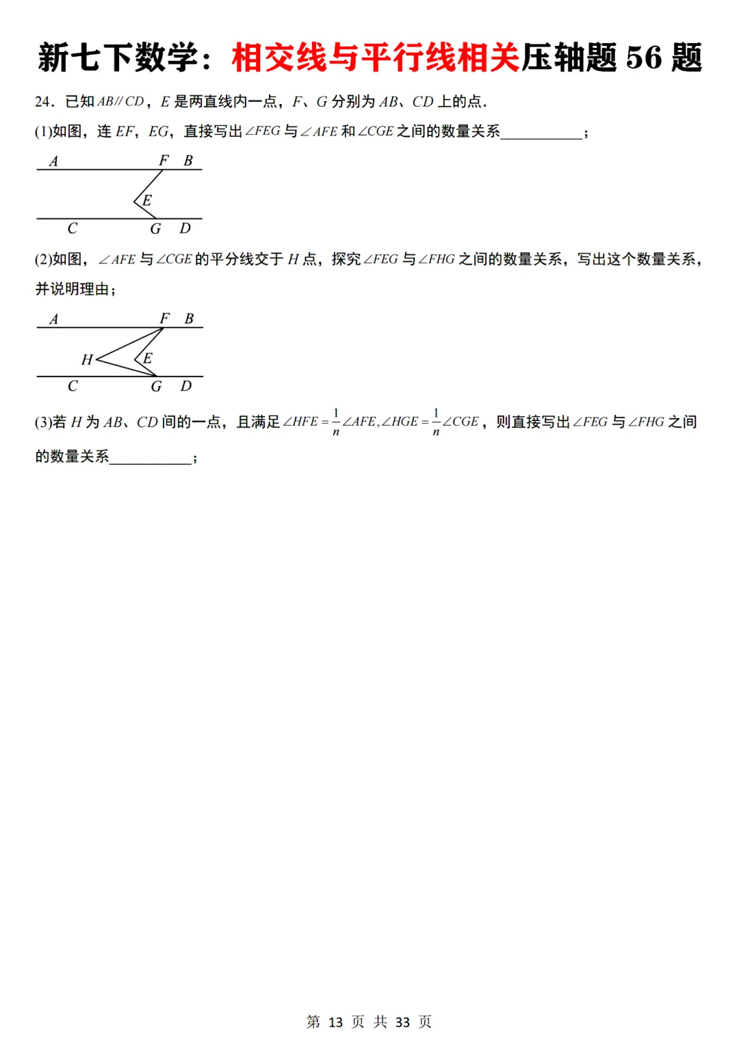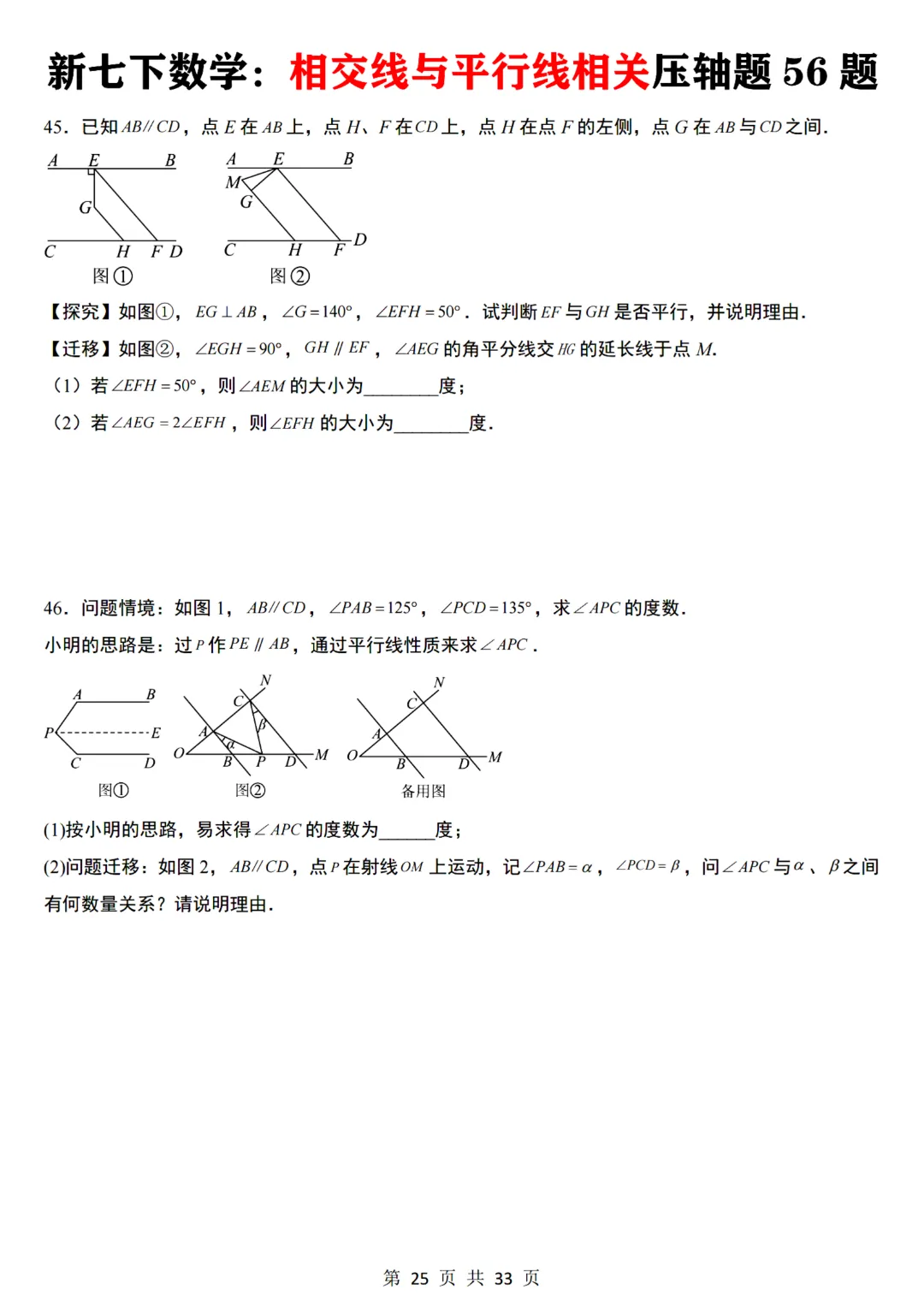 【七下数学通用版】初一下册数学相交线与平行线相关压轴题共56题带答案,完整可打印