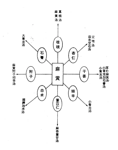 如麻黄汤(麻黄 + 桂枝 + 杏仁 + 甘草)、桂枝汤(桂枝 + 芍药 + 生姜 + 大枣 + 甘草)、小柴胡汤(柴胡 + 黄芩 + 人参 + 半夏 + 甘草 + 生姜 + 大枣)等 - 日本汉方解析