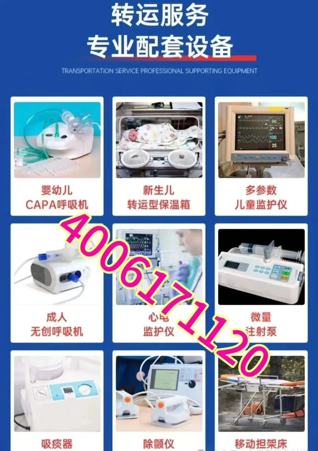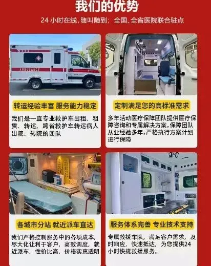 120非急救车辆 我公司承接高铁转运病人航空转运病人救护车转运’长途跨省转运病人新生儿、骨折、重症、危重症患者,行动不便者复查,转院、转诊、跨省回家,我们都能专业承接。专业救护车配备先进设备,随车医护经验丰富,全程守护生命安全。无论何时何地,只要您有需求,拨打4006171120 即可预约。我们费用透明合理,详细费用等您咨询,为您提供安心、可靠的转运服务。