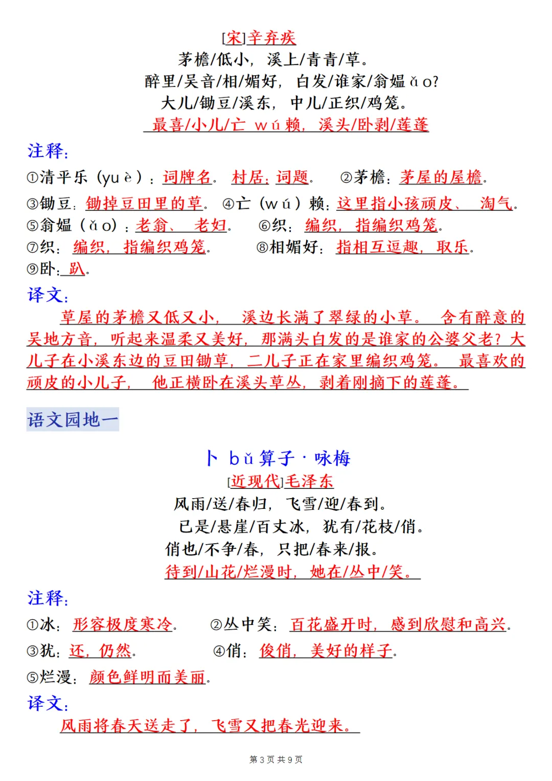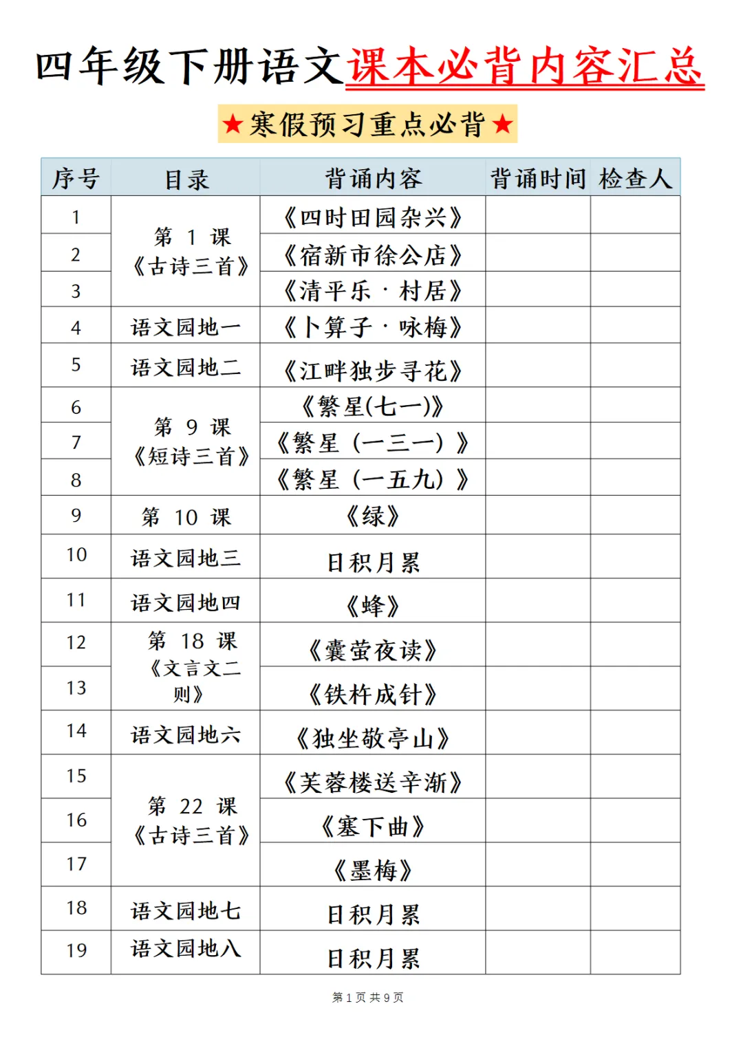 四下语文寒假预习课本必背内容汇总(9页)
