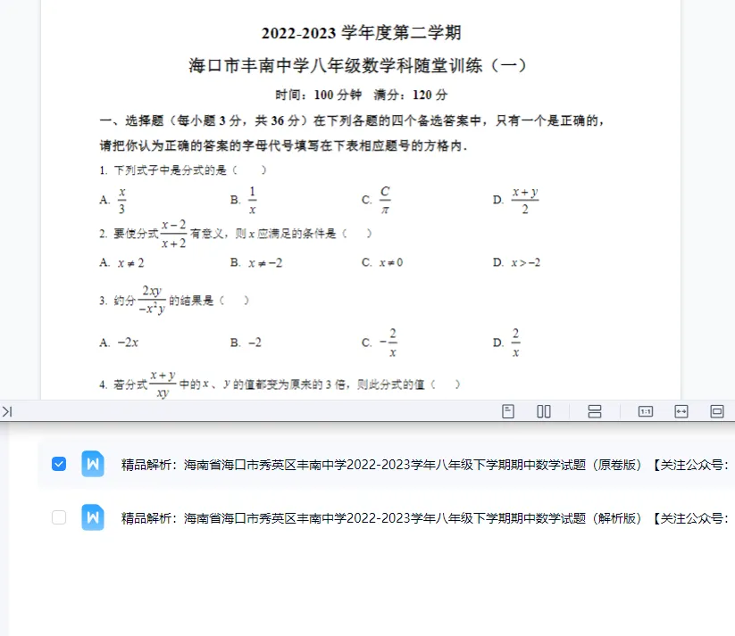 通过网盘分享的文件:【免费下载】精编海南省海口市秀英区丰南中学20222023学年八年级下学期期中数学试题