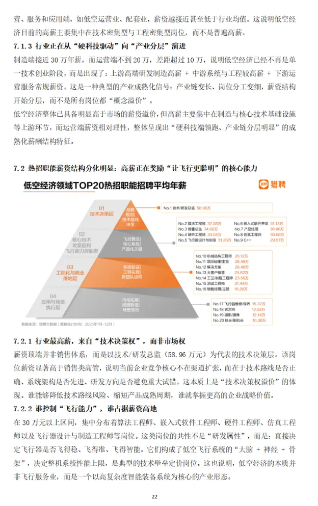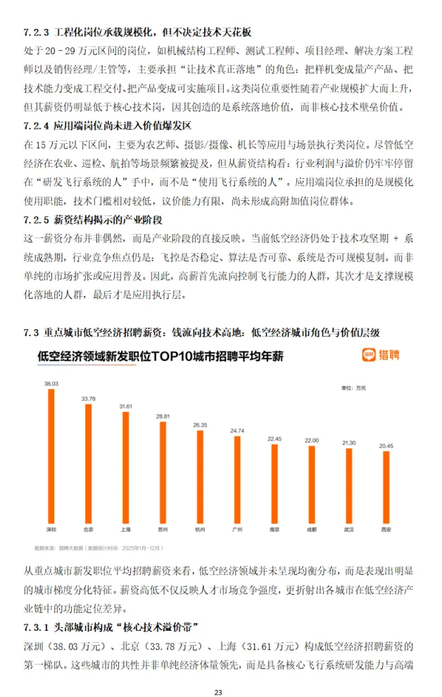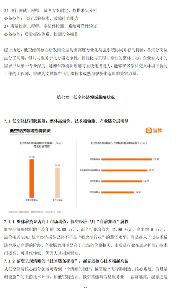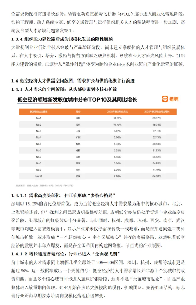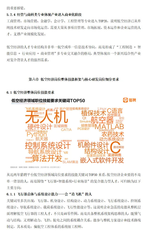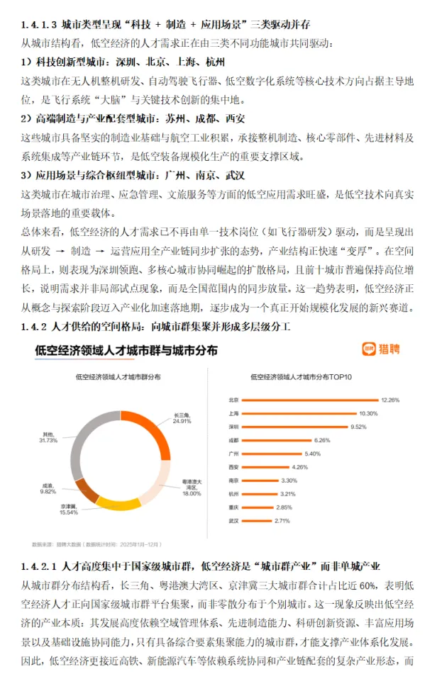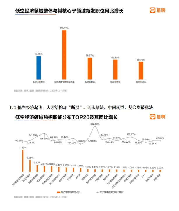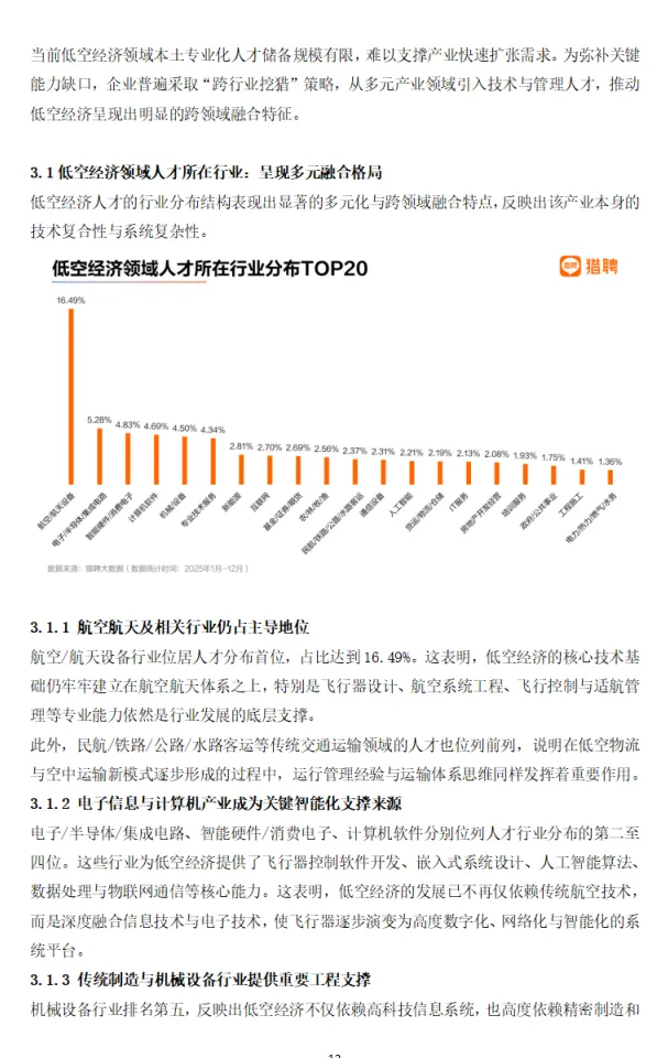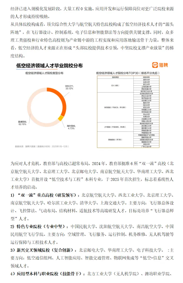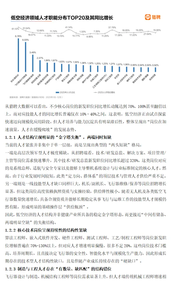 随着政策红利持续释放、关键技术不断突破以及应用场景加速拓展,中国低空经济正迎来新-轮繁荣发展期,产业规模与市场关注度同步攀升。低空经济已从概念验证阶段迈入加速落地阶段,成为推动新质生产力形成的重要力量。在这一关键产业窗口期,人才作为核心要素,其供需结构、能力层级与区域分布正深刻影响行业发展节奏与竞争格局。基于此背景,猎聘大数据研究院与航投人才联合推出《2026中国低空经济人才发展报告》(以下简称“报告”)。本报告基于猎聘大数据,系统梳理产业快速扩张阶段的人才供需现状、结构特征与核心挑战,深入分析人才来源、岗位能力、薪酬结构与城市分布格局,力求为产业企业制定人才战略、高校优化培养体系以及从业者进行职业规划提供数据支撑与趋势洞察。