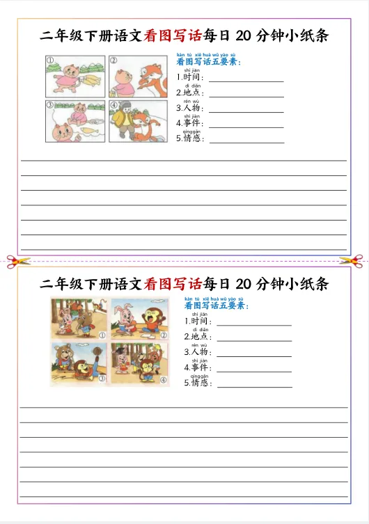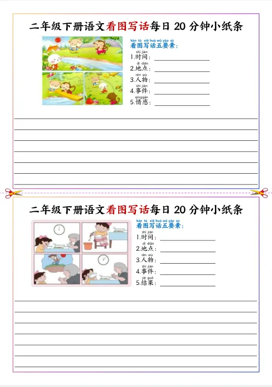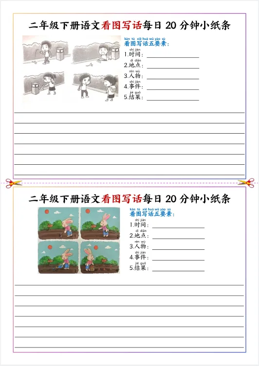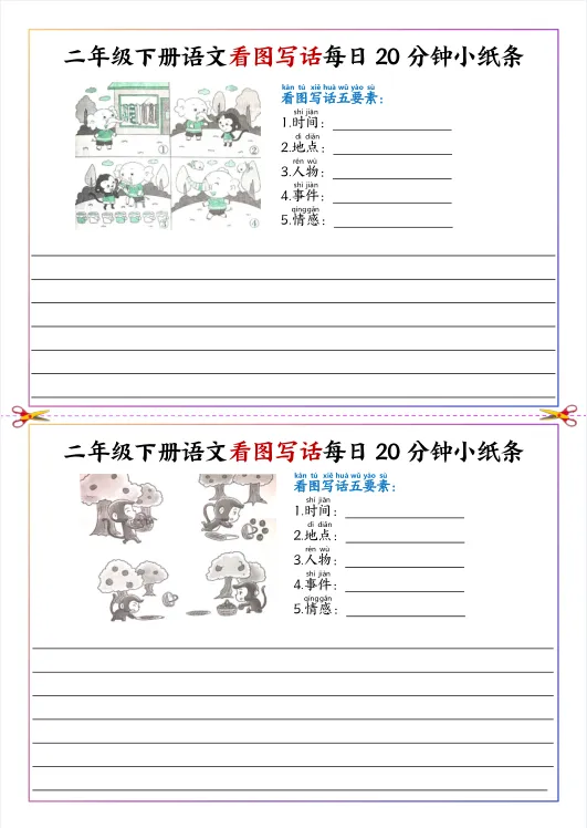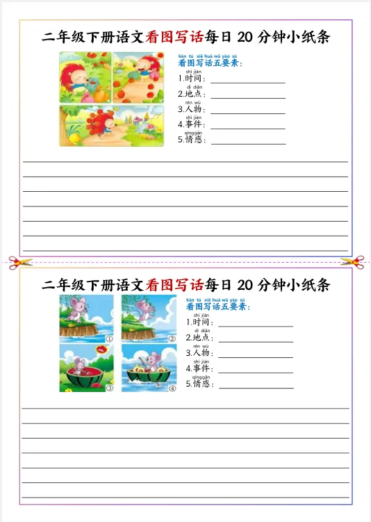 26春新二年级下册人教版(部编版)《语文看图写话每日20分钟小纸条》,共11页,电子版可下载打印。深化写作逻辑,构建完整叙事结构,提升思维层级,培养批判性与创造性,丰富情感表达,渗透正向价值拓展综合素养,适配二年级认知特点观。