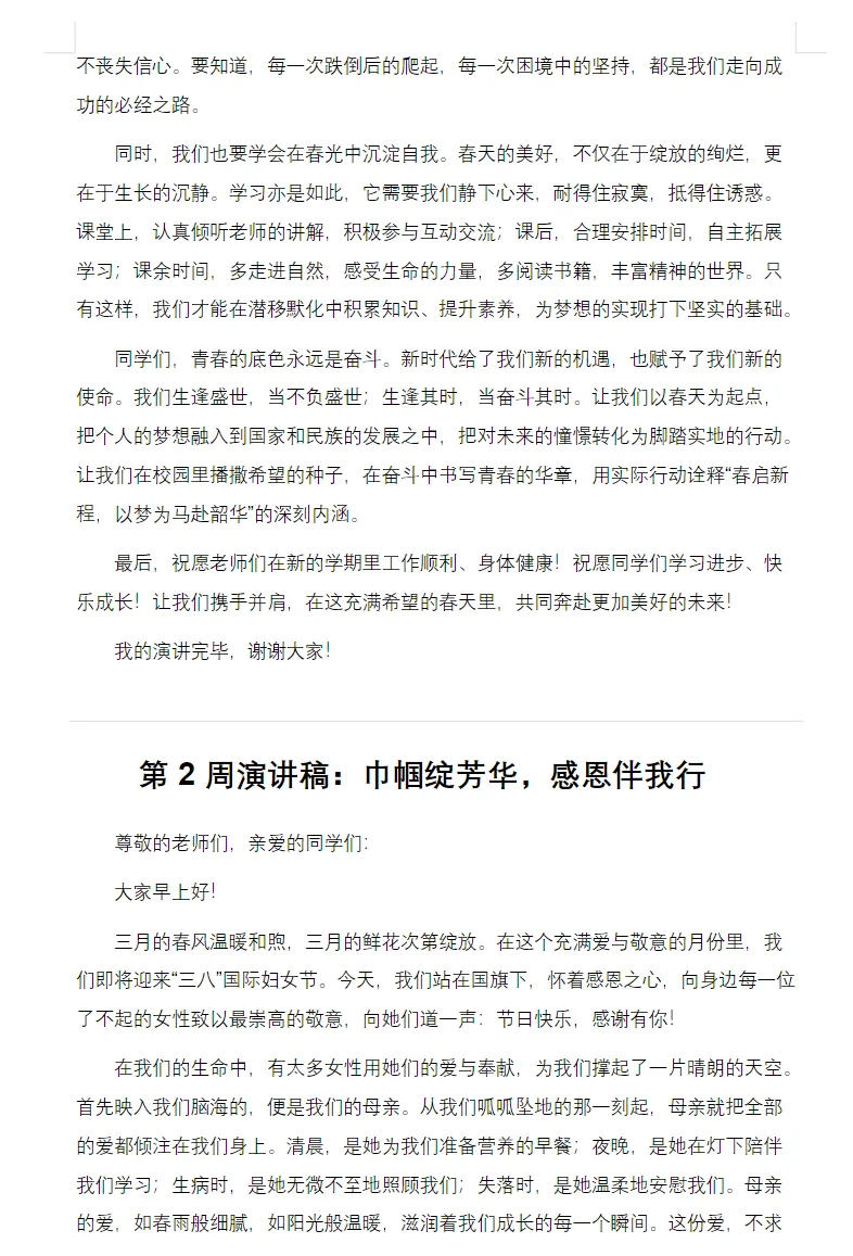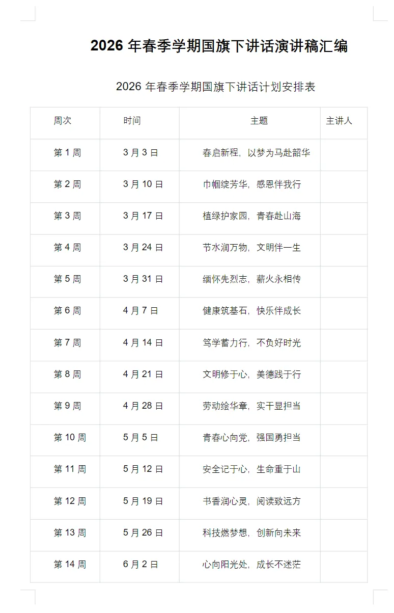 2026年春季学期国旗下讲话演讲稿汇编电子版可打印,共18周主题演讲稿#小学#国旗下讲话演讲稿#育儿教育#演讲稿#国旗下讲话