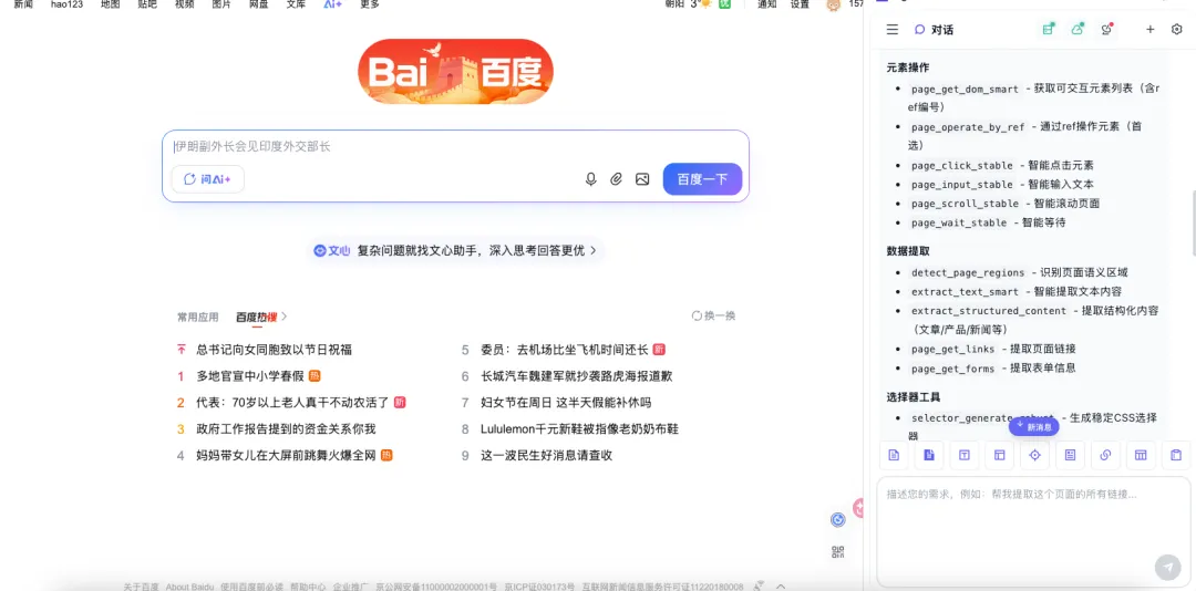 操作层 —— 直接操作当前页面:点击元素、填写输入框、滚动加载、切换标签页、截图。这些操作发生在你的真实浏览器里,用的是你真实的登录状态。