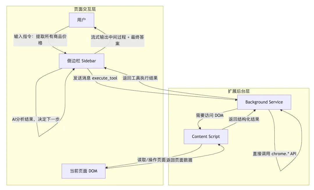 流程的核心是 Tool Dispatcher(工具调度层):需要读写 DOM 的操作转发给 Content Script 执行,需要浏览器特权 API 的操作在 Background Service Worker 中执行,纯逻辑操作在 Background 中计算。这种分层设计让每个操作都在最合适的环境里运行。
