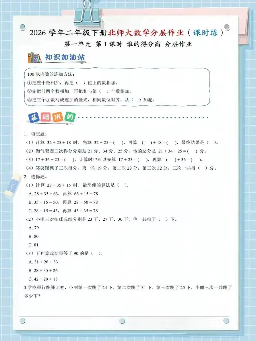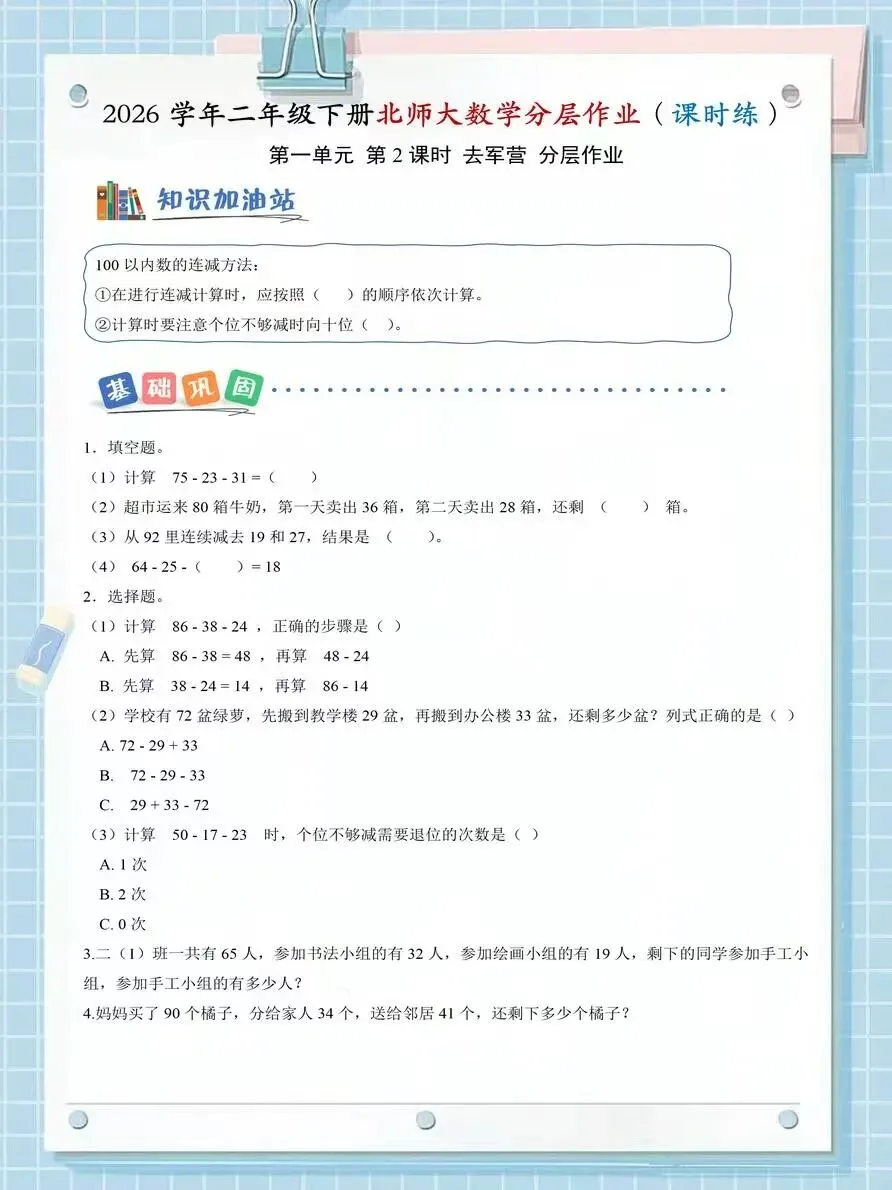 大家好!今天为大家分享的是;2026春新版二年级下册北师大版数学课内分层一课一练(基础篇+提高篇+拓展篇)题型全面,含答案,电子版可打印