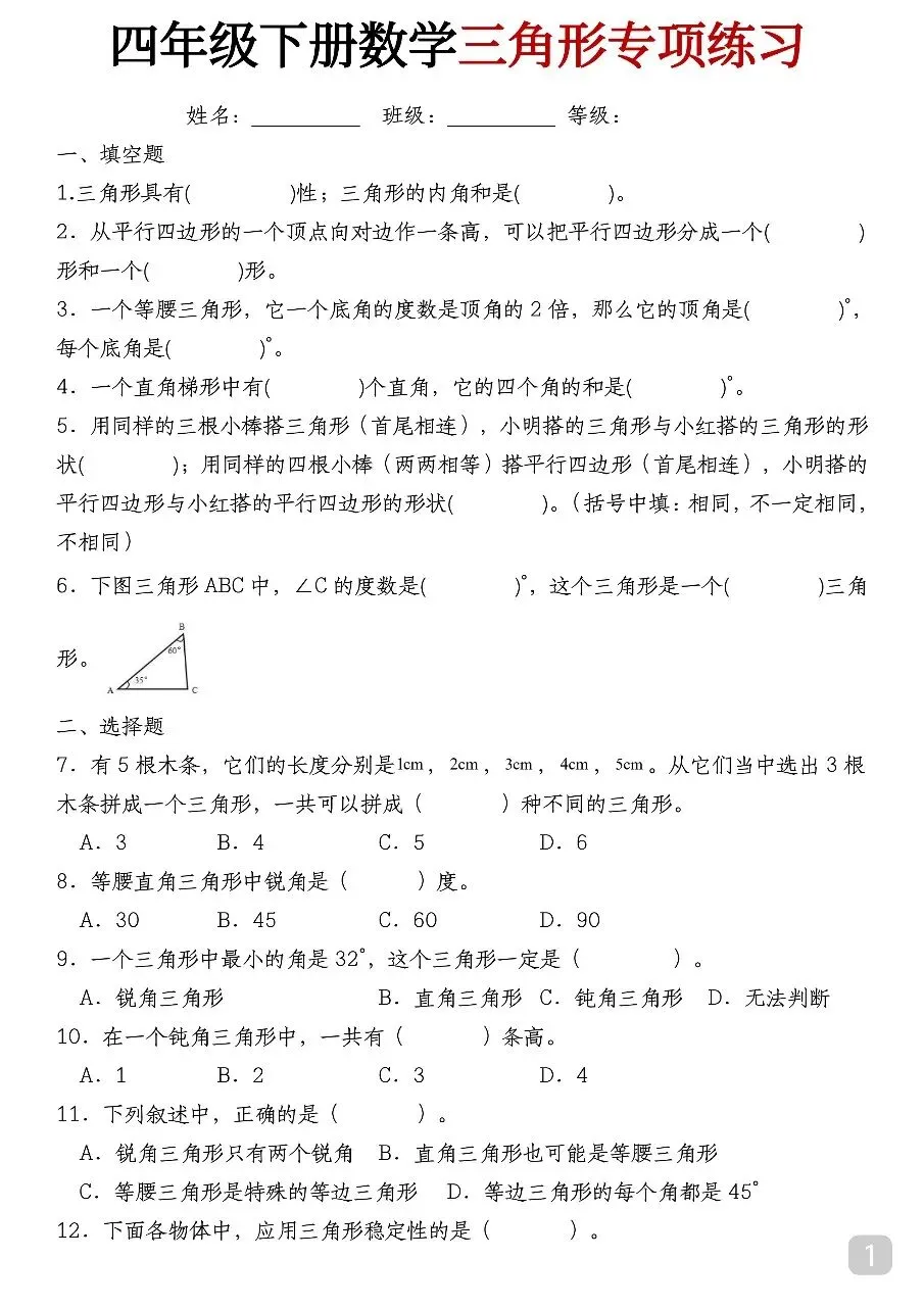 四年级(下)数学三角形专项训练.pdf 篇幅有限,无法全部展示。 请按照文末方式领取,无门槛永久免费,欢迎转发,帮助更多有需要的人~ 温馨提示: 文末有完整电子版领取方式! 领取完整电子版: ①:点一点右下角的“👍”和“❤️” ②:在公众号对话框中回复“资料1217”