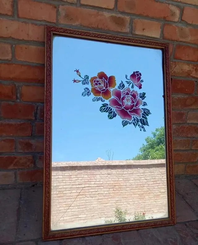 这彩色画盘是老座镜,新人结婚摆在桌面上的吉祥物,图案大多画着骏马、仙鹤或者牡丹,玻璃中还能倒映出自个喜气洋洋的样子,结婚那天两口子照一照,美好图个好兆头,现在老镜子还能翻出来,玻璃后背早起了花,彩画还留着从前的吉祥意思。
