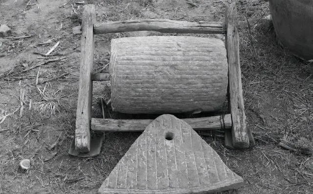 那大块石头嵌在木架里,叫碌碡,原来是碾谷脱粒的家伙,牛一拉石碌碡,晚上连轴转,秋收时候夜里还在场院上滚,带点泥土味和牛粪味,小孩站着看,能看一晚上,盖房打地基也有用场,现在田里全靠机械,这种老石头只有老场院里偶尔还能发现。