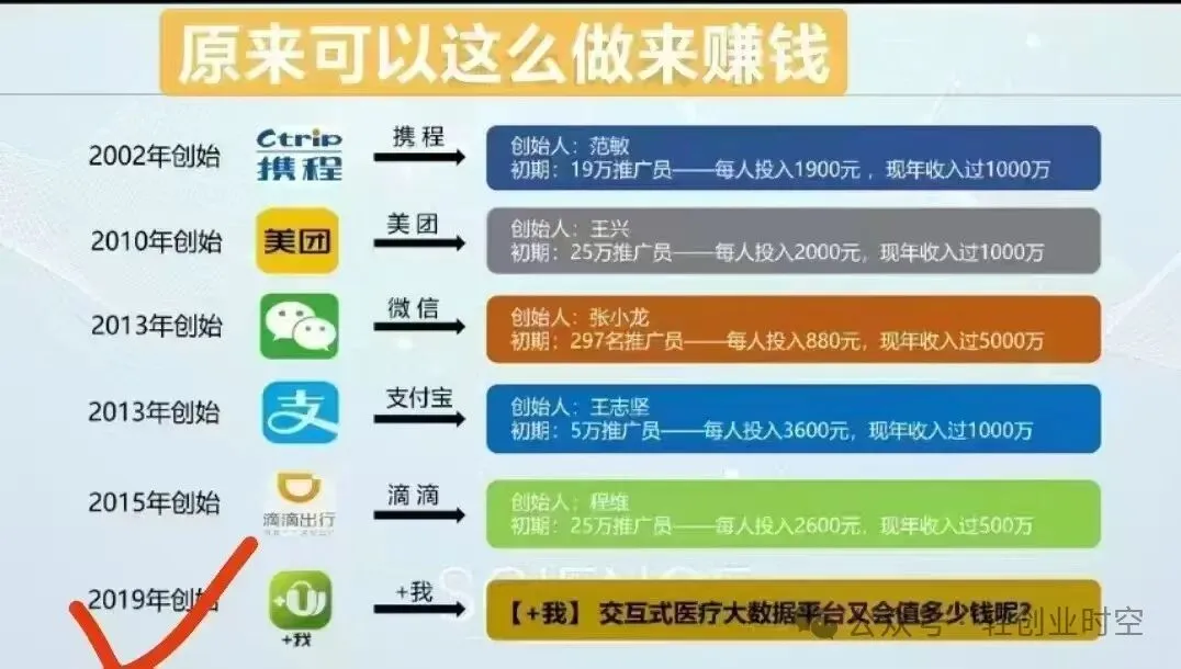 打车有滴滴、出行走路有高德、外卖有美团、电商有淘宝和京东、沟通有微信、支付有支付宝、住酒店有携程等等;我们的吃穿住用行等方方面面都被互联网各种APP关联起来了!我们今天成为了这些APP的使用者也就是用户,这么多APP我们却没能成为最原始的推广者和参与者!你知道第一批的参与者如今现状如何?