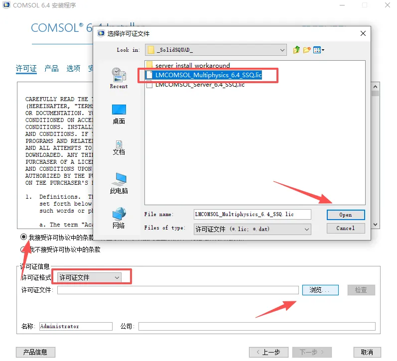 3、勾选我接受许可协议,选许可证文件,找到刚刚解压的文件夹,里面的【Crack】文件夹,选择LMCOMSOL_MultiphysicsSSQ.lic,点击【打开】,点击“下一步”;