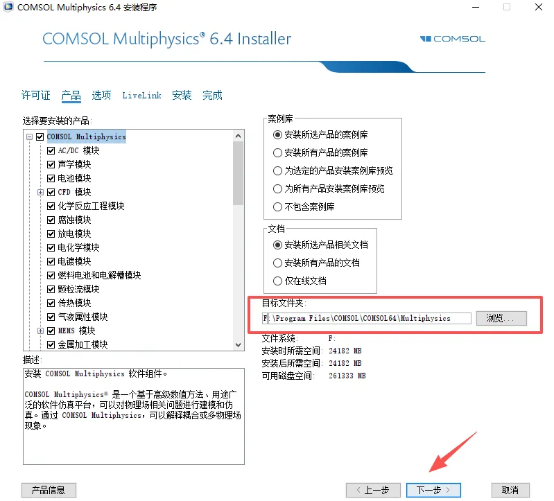 4、选择您需要安装的产品(默认全选),并选择软件安装位置,可以把地址栏首字母C改成D,软件就会安装到电脑D盘,也可以自行修改安装位置(但注意安装路径不要有中文),点击“下一步”;